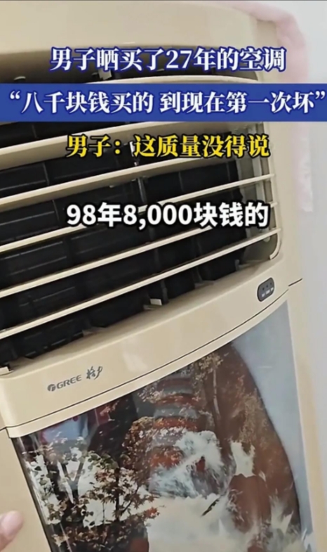 “太耐用了!”河北,一男子98年花8000元买了一台格力空调,空调质量好得不行,整整用了27年都没坏,到现在第一次坏,今年这老伙计亮黄灯了!