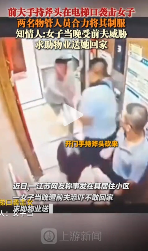 信源来自:上游新闻——7月19日报道时间,#前夫手持斧头在电梯口袭击女子,两名物管人员合力将其制服,知情人:女子当晚受前夫威胁,求助物业送她回家