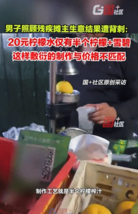 “吃相真难看!”江苏扬州,一男子看到残疾摊主晚上还在摆摊后,便上前支持对方生意,没想到,摊主仅用半个柠檬和雪碧就做好了一杯饮品,男子付钱时,摊主才将价格表拿出来,这样敷衍的制作竟然要他20元,男子虽气愤但还是给了钱,网友:这个价格是路边摊该有的价格吗? 据国+社区7月21日消息,男子回家途中,看到有辆三轮车停在路边,他仔细查看后发现摊主少了个胳膊,天色已经暗下来,路上人流量非常少,并没人到他的摊位前买饮品。 摊主虽有残疾,但没自暴自弃,反而付出了比常人更多的努力,只为维持生计,这样的精神让男子很是感动,即便他不想喝饮品,也要买一杯。 他和摊主交流的过程中,发现对方不会讲话,男子更心疼了,他要了柠檬水,看着摊位的环境,想着价格应该不会太贵,况且市面上同样饮品,也不过几块钱。 所以他即便没看到价格,也信任摊主的为人,可摊主当着他的面丝毫不加掩饰,柠檬水制作流程实在太简单了,他自己买回家也能做,成本最多三四块。 就算对半挣男子也不会多说什么,可摊主的要价实在让他意外,就算是知名品牌都没这么贵,男子感觉自己被“背刺”,但面对摊主的身体情况,他也不好多说什么,给完钱就离开了。 至于买的饮品,男子连喝都没喝,大家买东西前最好问清价格,对于漫天要价的,直接走人,正常价格大家都会支持,唯独不能利用众人的同情心。 对于这件事情,大家有什么看法? 信息来源:国+社区 2025年7月21日
