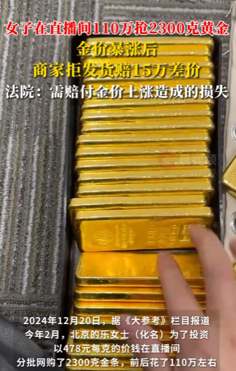 2024年,女子趁着金价形势大好,在网上花110万买了2300克金条。却不料,商家眼红金价涨太快竟拒绝发货。女子说原本想趁着这个机会理财,却因为商家玩不起,让她每天亏钱。商家:“我们愿意承担违约责任,但货是发不了!”法院这么判了。