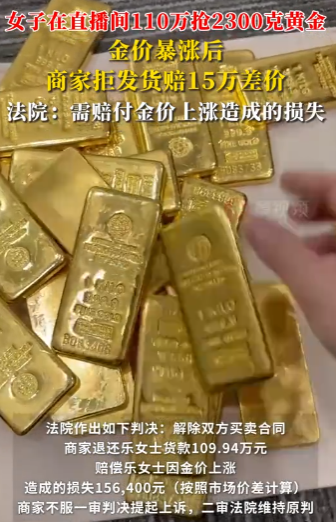法院最终判决商家不仅要把110万元全部退还,还要额外赔偿乐女士15.6万元,这部分赔偿是根据她下单的价格和法院判决当天的市场金价计算出的损失。