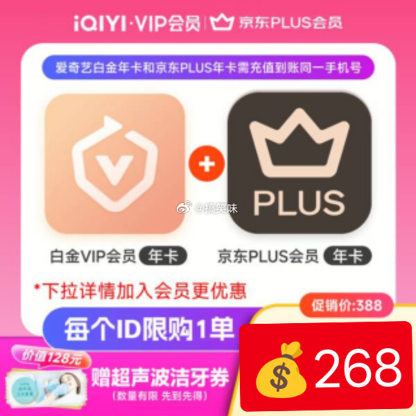 京东plus联名会员(记得取消自动续费)爱奇艺VIP黄金会员年卡 158元拍下:爱奇艺VIP黄金会员年卡168元爱奇艺会员+京东会员年卡拍下:网页链接②268元 VIP白金会员360天+京东PLUS年卡拍下:网页链接好价情报站