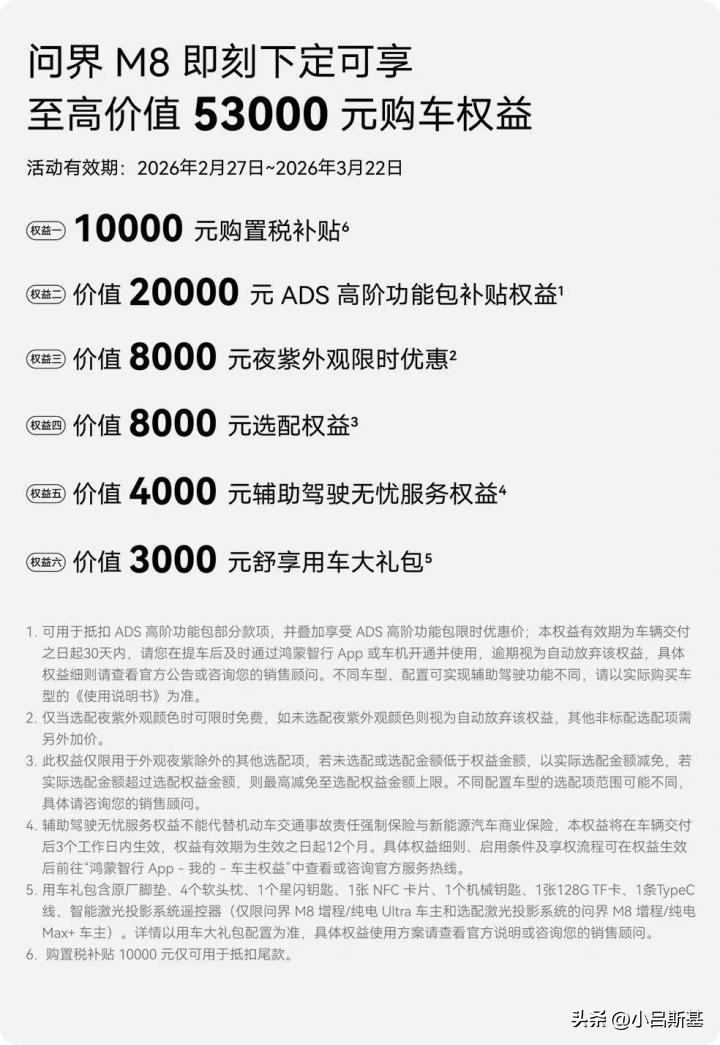 最近,问界M8特别推出3月限时购车权益,2026年2月27日至3月22日,下定可享至高价值53000元购车权益,多重补贴叠加让利,将进一步降低高端智慧出行门槛,助力家庭用户轻松拥享旗舰级出行体验。 本次购车权益具体包括:10000元购置税补贴(可用于抵扣尾款)、价值20000元ADS高阶功能包补贴权益、价值8000元夜紫外观限时优惠、价值8000元选配权益、价值4000元辅助驾驶无忧服务权益,以及价值3000元舒享用车大礼包,覆盖用户购车、用车、服务等多元场景,为用户带来实打实的新豪华价值提升。
