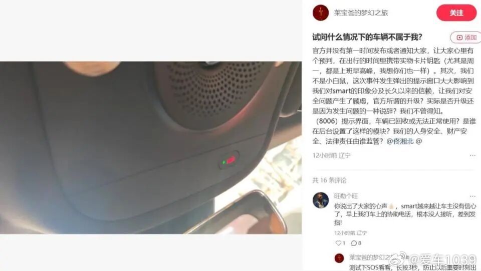 【爱车安全贴士 一觉醒来,车被回收或无法使用??这些汽车新“坑”需警惕!】一觉醒来,车被收回了?”这可不是什么科幻电影桥段。3月9日清晨,全国多地smart精灵5车主迎来一场猝不及防的“用车危机”——手机App无法连接车辆、蓝牙钥匙失效。部分未标配实体钥匙的车主被困车旁,陷入“手握车权却开不了车”的窘境。网页链接