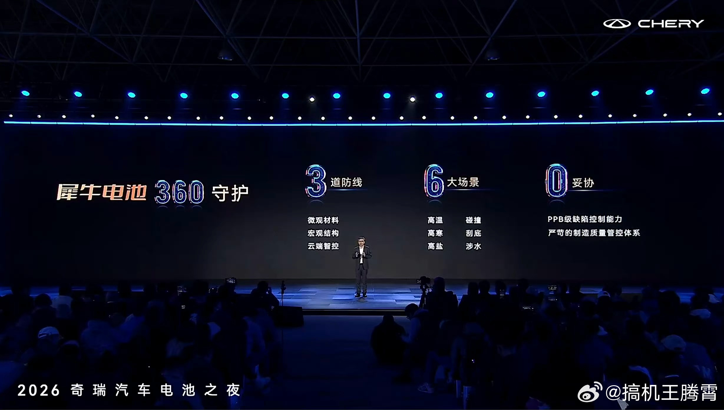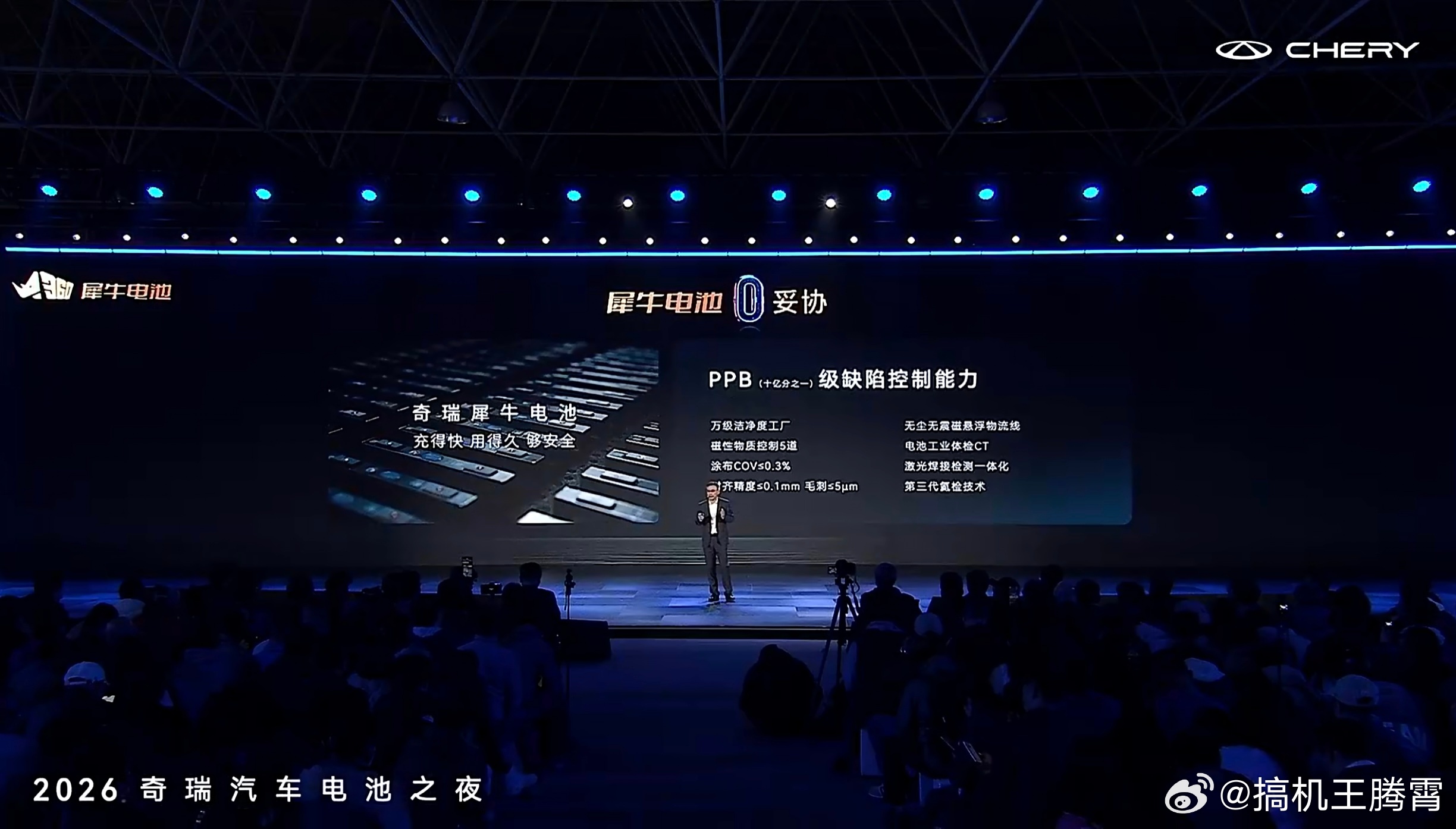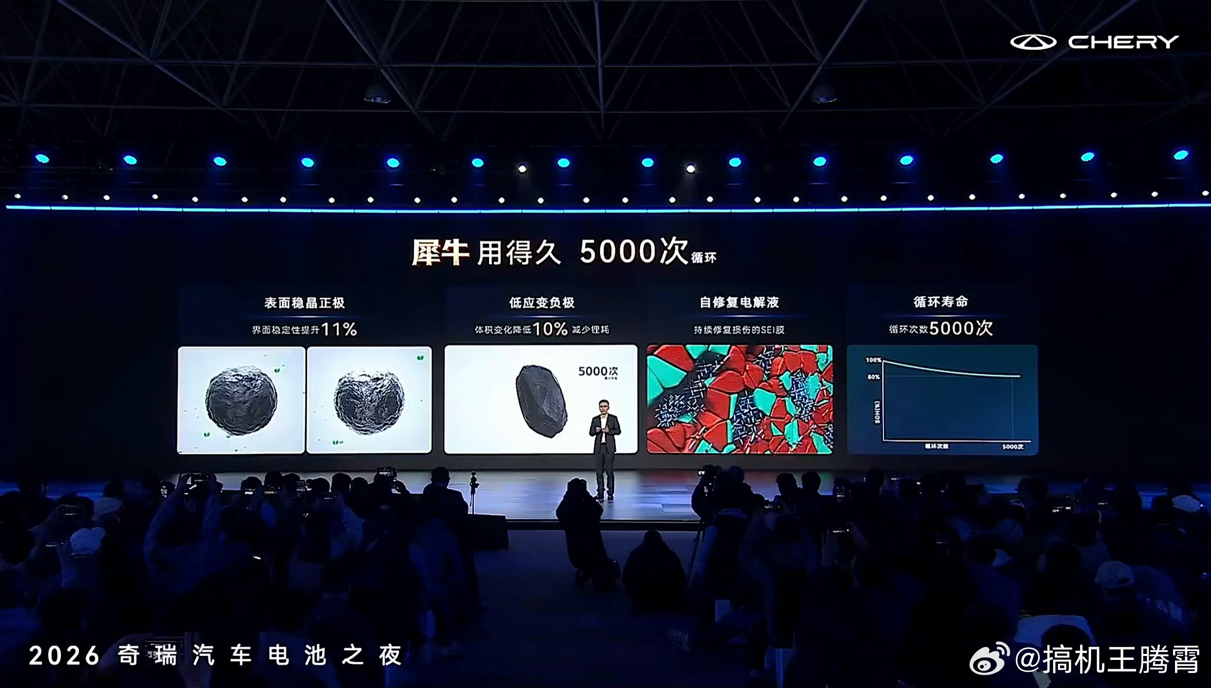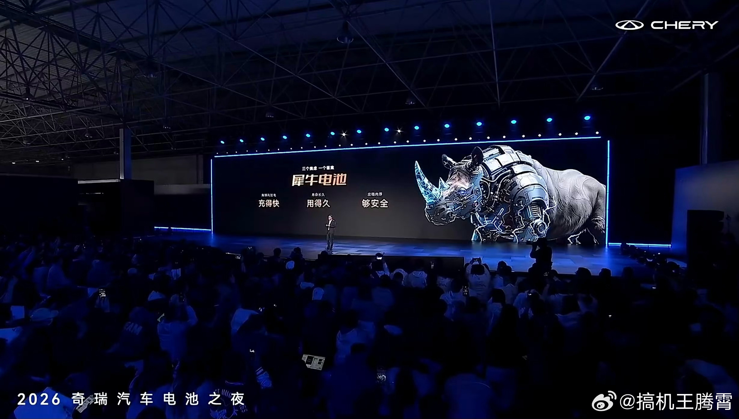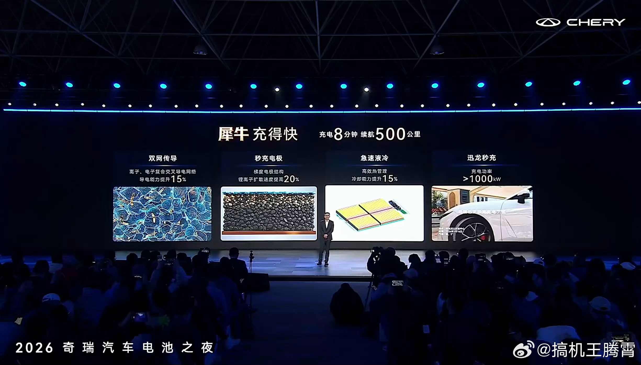 今晚2026奇瑞汽车电池之夜上,奇瑞正式发布了犀牛电池,说是最大充电功率可以达到1200kW,8分钟就能补能500km,循环寿命达5000次,并且采用采用犀晶材料,所以更加安全,目前犀牛电池已经完成了2500万公里的多场景验证。同时奇瑞发布了“迅龙秒充”超充补能技术,最快部分场景下可以实现5分钟补能500km,补能效率比肩传统燃油车加油,用了新一代SiC器件,建设周期方面到2029年完成核心网络布局,目标建成20000+座迅龙秒充站。