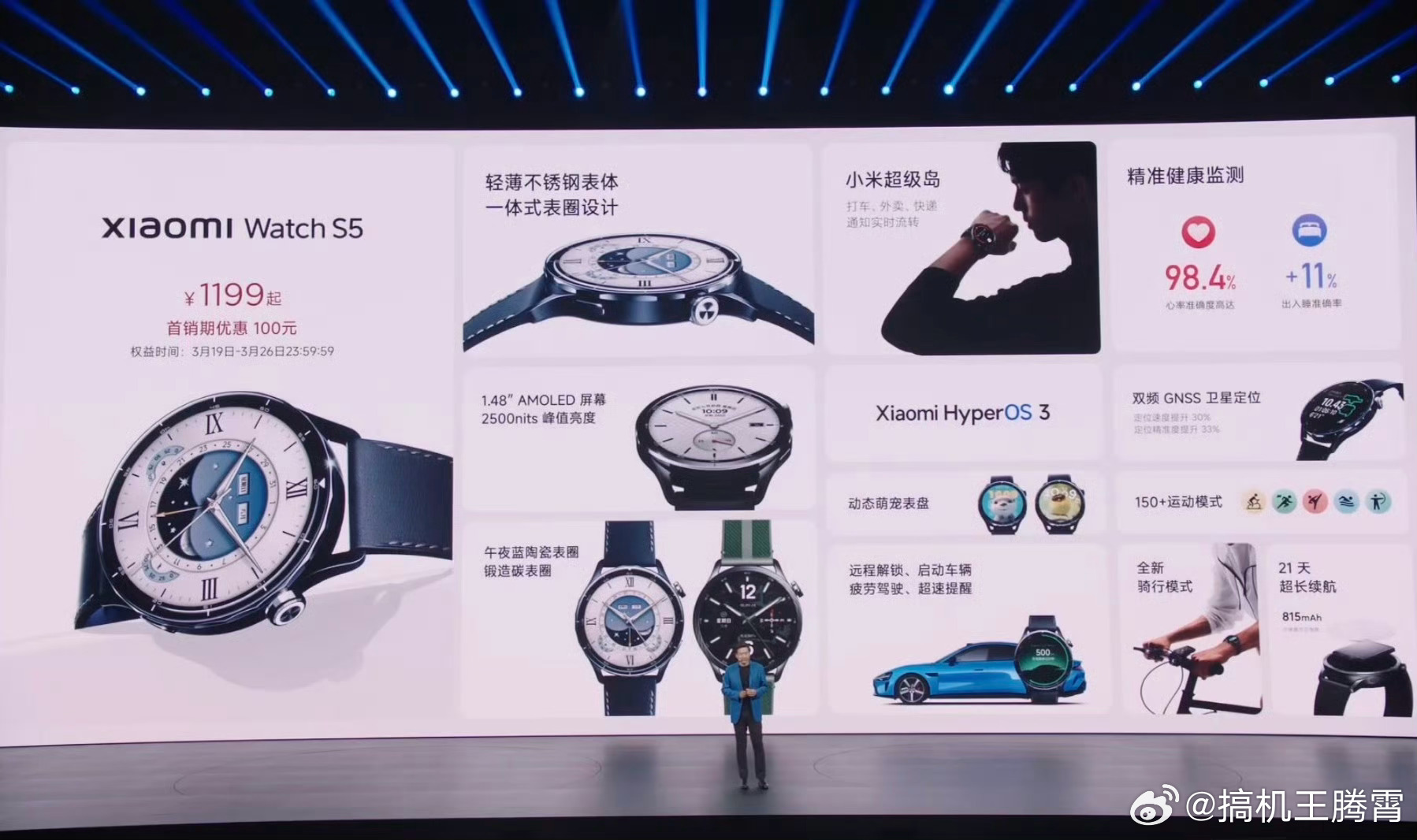 还有一款小米手表S5,1.48英寸圆形OLED屏幕,峰值亮度2500nits,内置815mAh金沙江电池,可以实现21天续航,重46g,卖1199元起。