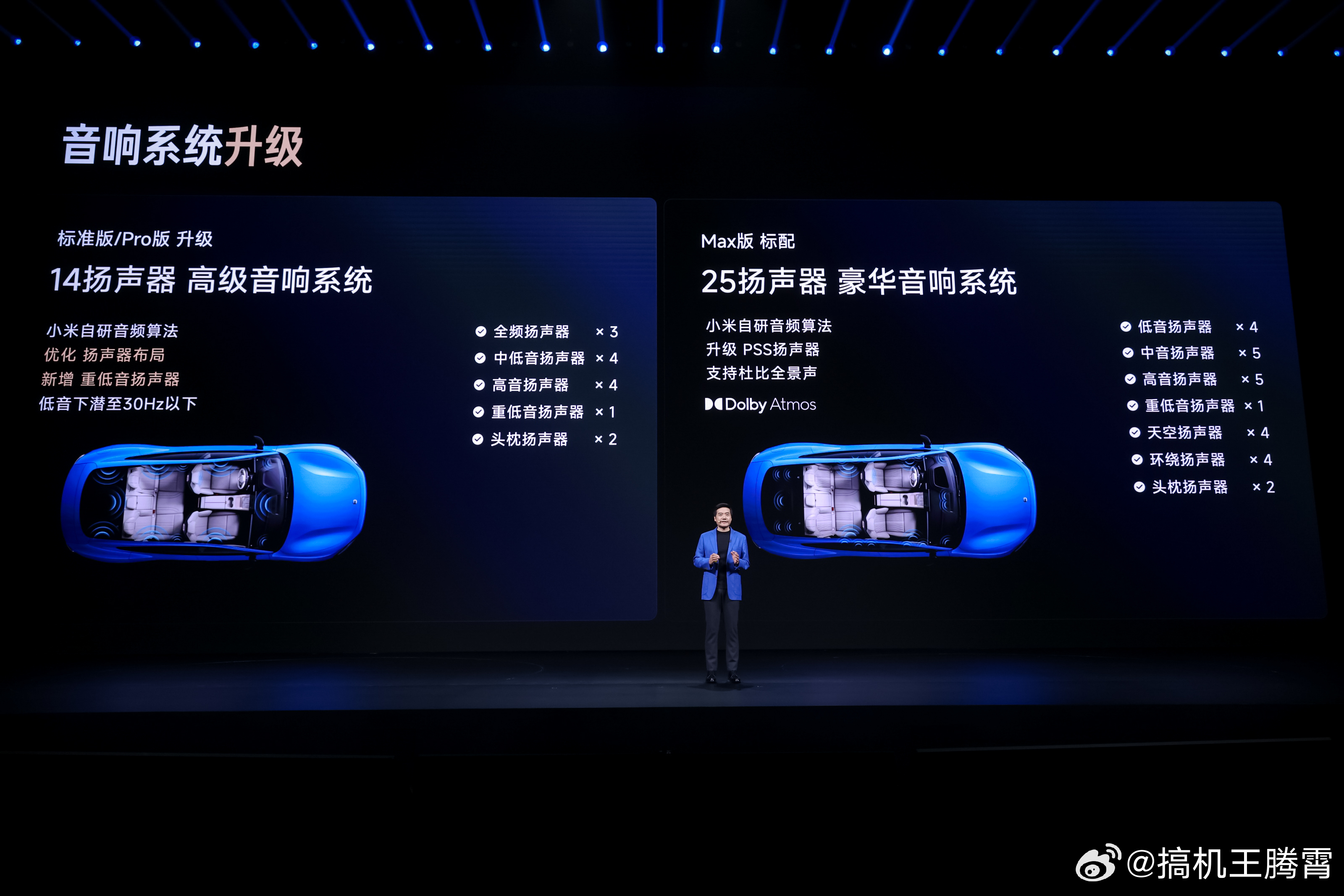 Pro版本96.3度电池包(CLTC续航902km),Max版本101.7度电池包(CLTC续航835km),Pro和Max版本标配CDC和双腔空簧,标准版零百5.28秒、Pro版零百5.7秒、Max版零百3.08秒。标准版和Pro版升级14扬声器,Max版标配25扬声器,座舱芯片和辅助驾驶芯片也和YU7一样了,用的骁龙8 Gen3,这次底盘也升级了,搭载小米蛟龙底盘,全系标配激光雷达,支持车外语音,这些升级喜欢吗
