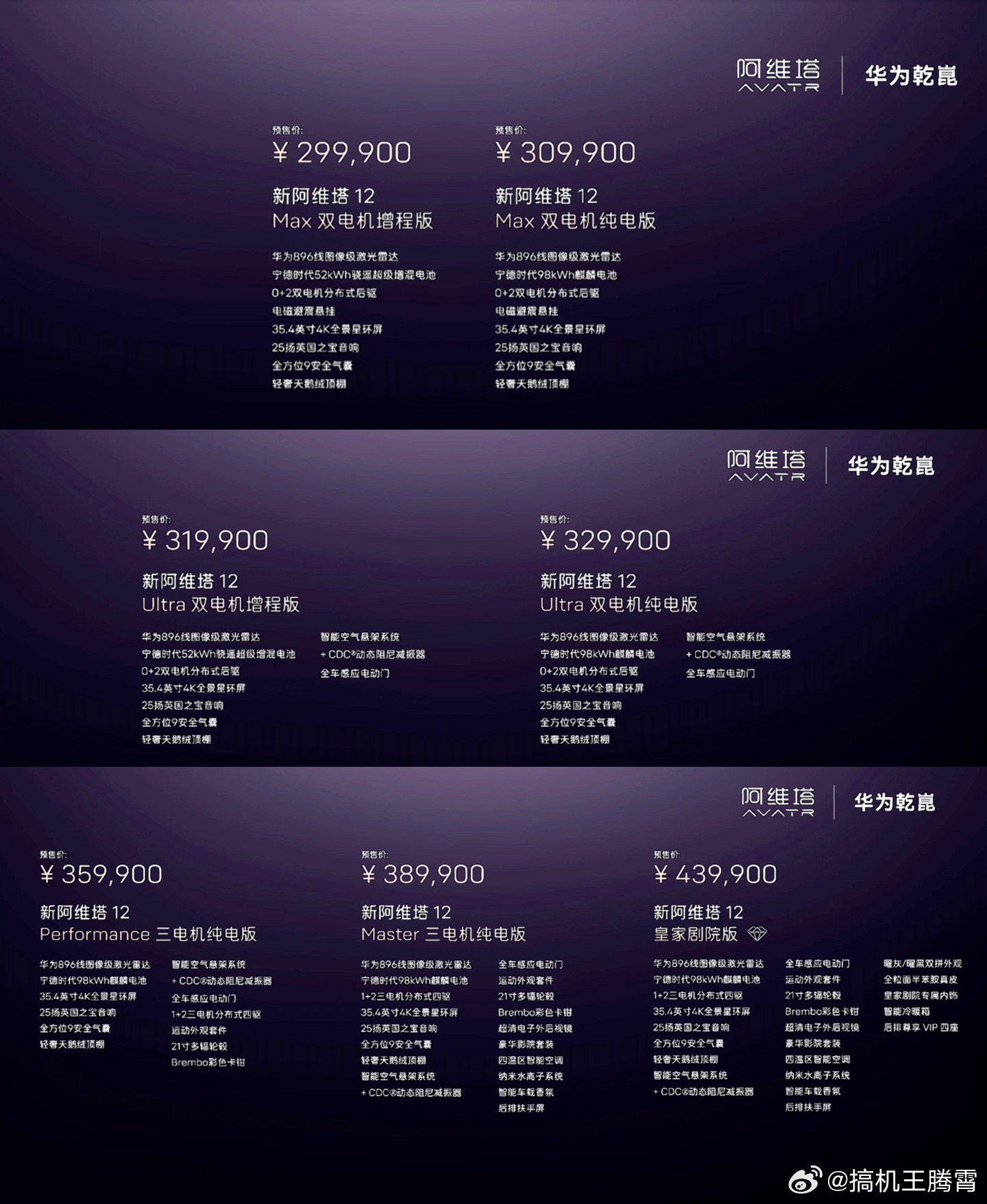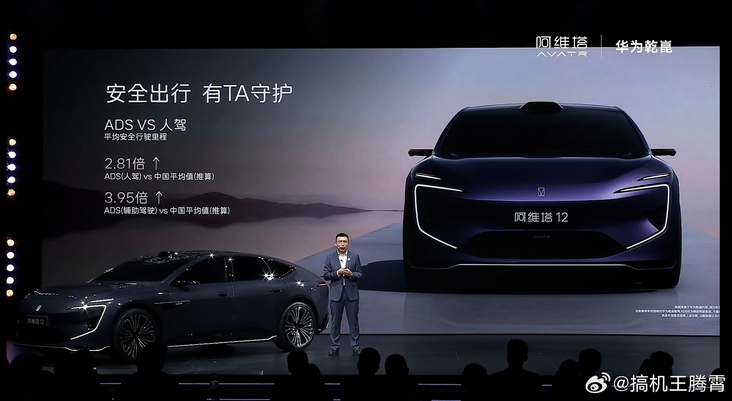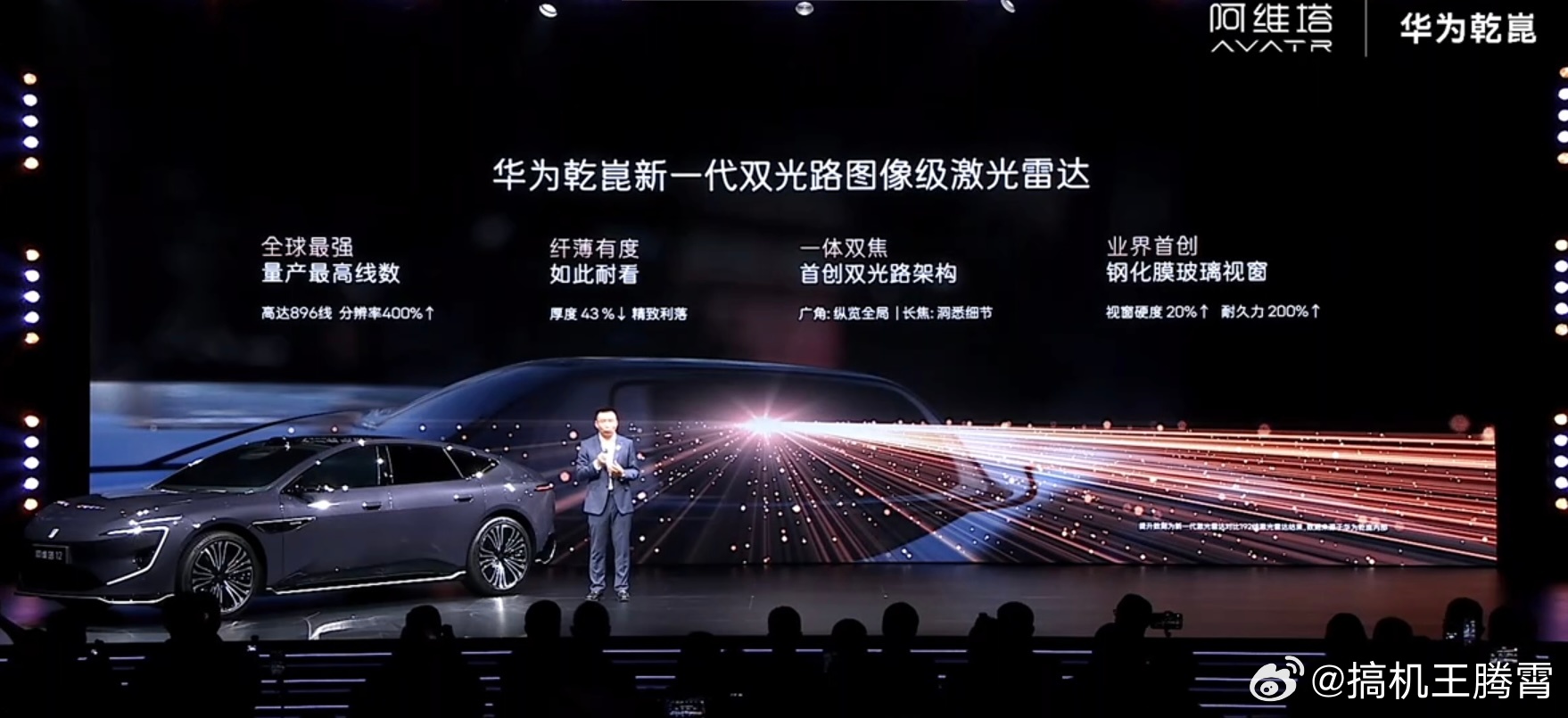 今晚新款阿维塔12开启预售了,外观还是一如既往的特色,提供三电机版本,零百最快2.71秒,搭载太行分布式电驱技术,每秒超40亿次算力,号称可以在220km/h的速度下爆胎不失控。全系搭载华为乾崑全维防碰撞系统CAS 4.0和鸿蒙座舱,并且搭载华为全球量产最高的896线双光路图像级激光雷达和ADS 4.1,全车标配32个传感器。