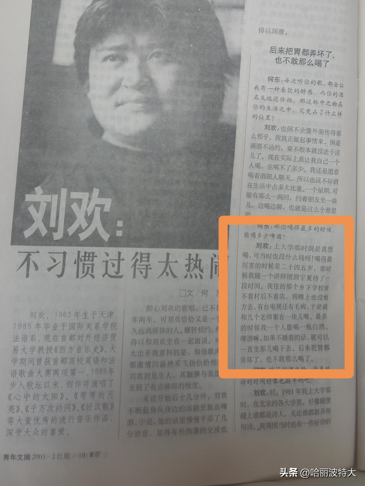 想不到刘欢老师年轻时候酒量大的惊人,白酒一瓶,啤酒可以无限续航,真不是一般的厉害啊! 这是03年刘欢老师接受媒体采访时亲口说的,当时他在宁夏调研,电视机坏了没有什么可以消遣的,晚上只有和当地的老师喝酒打发时间,酒量是那时候练出来的,身体也是那时候糟蹋的。