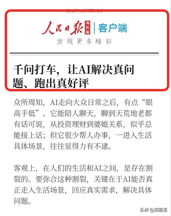 千问上线新功能,一个新的时代开始了? 每一次的技术革命,都会带来巨大的变化,这种变化,会推动社会更快的向前发展。 AI技术出现之后,很多人都在讨论AI的应用方向在何方,AI对于普通人的意义在哪儿。而千问则用行动告诉大家,AI会让生活更方便,让普通人的生活更美好。 春节期间千问推出了一系列活动,让大家体验到了AI办事、AI购物的神奇。在三月底,千问再次升级上线新功能——AI打车。 对此人民日报还发表了评论,说千问在解决的是真问题! 有如此高的评价,说到底两方面的原因。 第一:AI打车的出现,确实让普通人的生活更方便了,打车只需要给千问说出自己的需求,无论多复杂,它就能全部搞定,非常符合当前普通人的生活需求。 第二:千问AI打车上线,用技术实力,支撑了现实生活场景中的需求,代表了中国AI应用的前进方向。 而千问能做到这一点,背后能反映出的是,中国AI技术注重实际应用的事实,以及阿里大模型的能力。 要知道AI打车这个事儿,海外的谷歌等公司也在做,但目前只在国内落地应用了。所以,按照这个情况来看,千问AI打车虽是AI应用前进的一小步,但放到世界范围内,却是中国在科技领域竞争中领先的一大步。 AI竞争的时代,中国已经走到前面了!