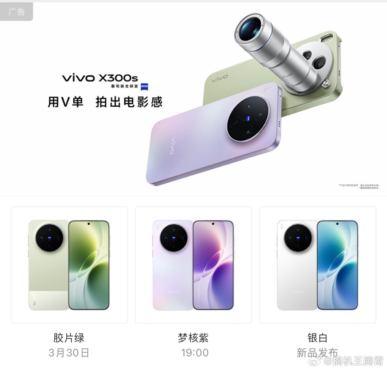 【vivo X300s/X300 Ultra所有配色公布】vivo X300s:胶片绿、梦核紫、银白、灰四个色vivo X300 Ultra:胶片绿、银调、黑Ka三个色