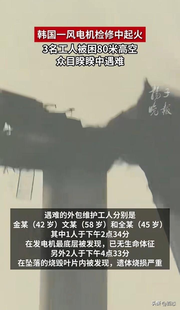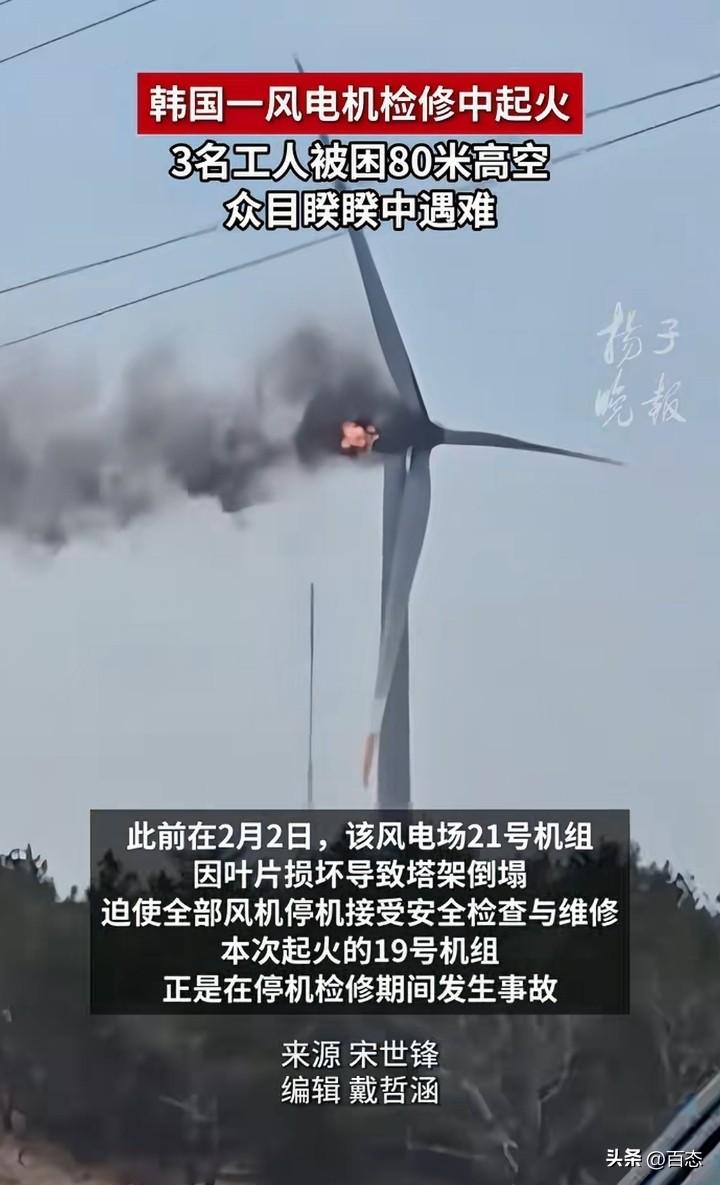 可惜了,韩国一风电机在检修的过程中起火,3名工作人员被困80米高空,由于逃生路线被大火堵死,3名工作人员无处逃生,不幸遇难。谁也没想到会遇到这样的事。 发生这样的事,给我们也提了个醒,在高空作业时,要如何预防这些安全隐患,还要安全措施,以防万一。 本来可以避免的事情,估计他们也没有想到会起火,可惜了。 希望大家引以为戒!做什么都要预防!