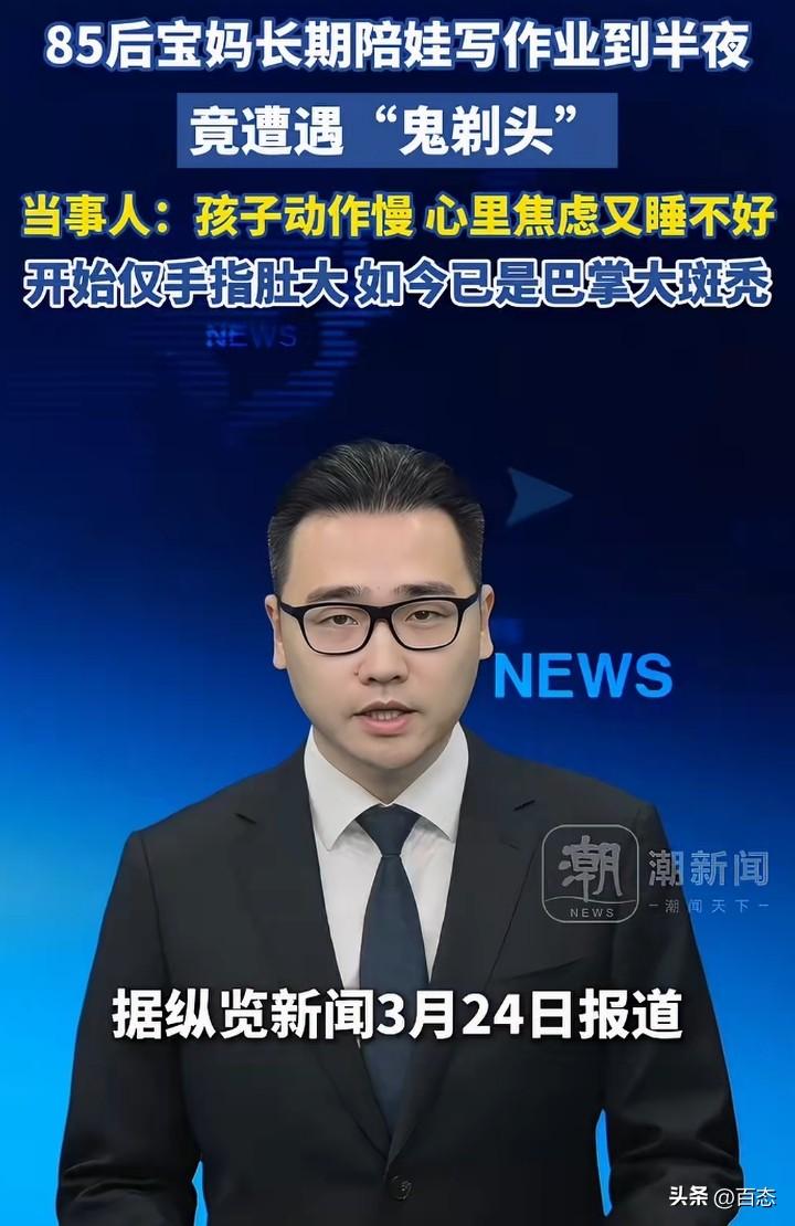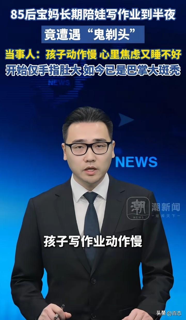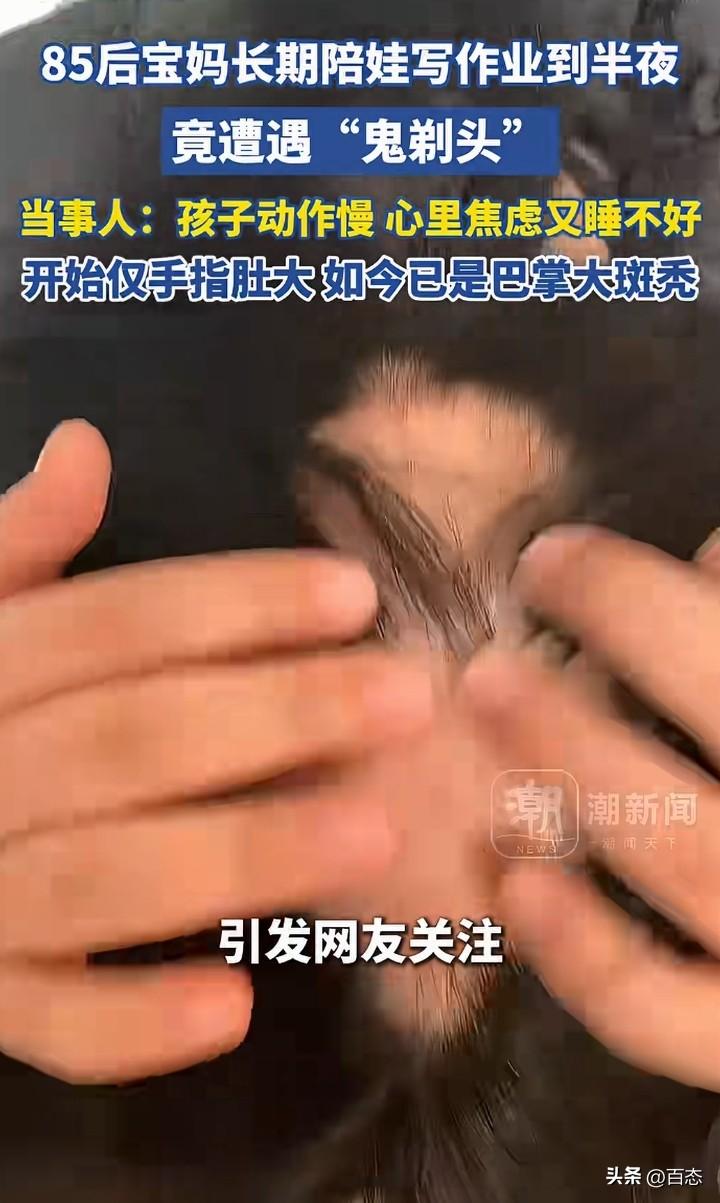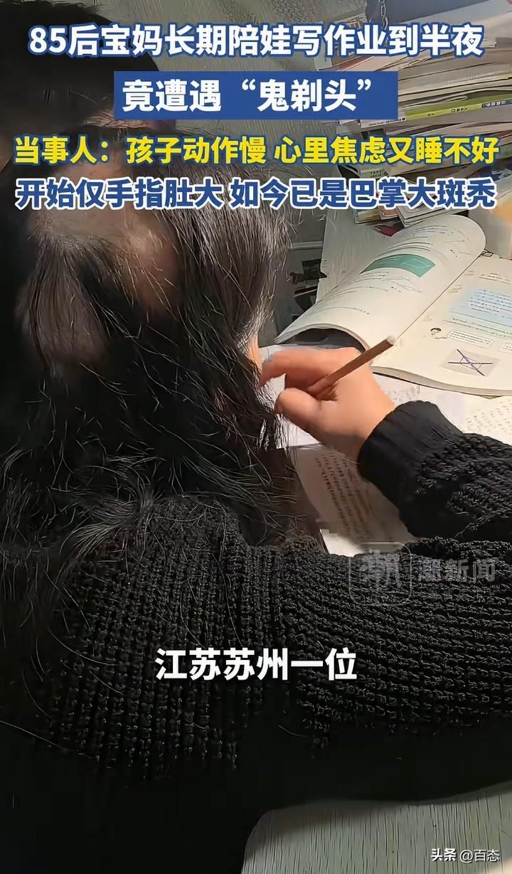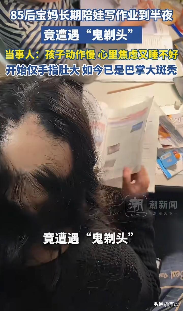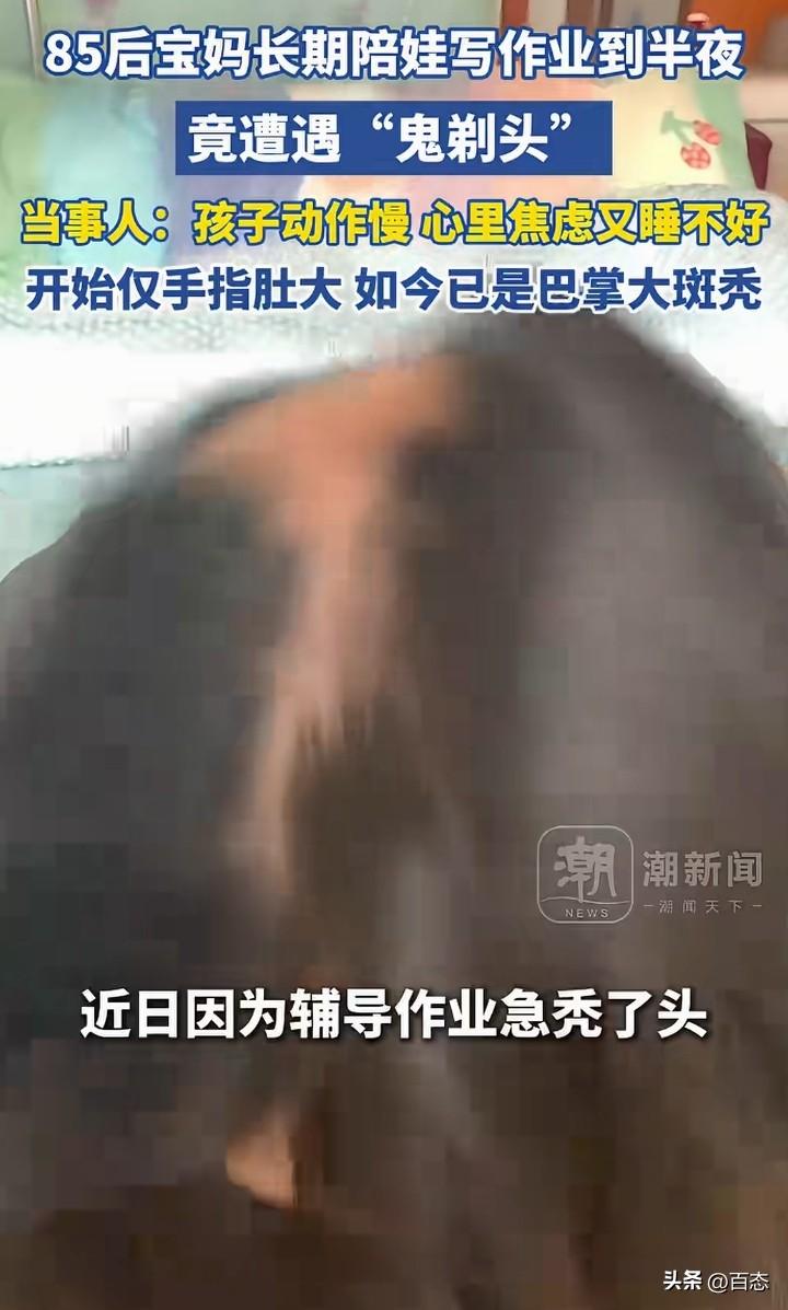 不敢相信,辅导孩子写作业,居然都能把自己的头发都熬掉不少。江苏苏州一位85后宝妈长期给孩子辅导作业到半夜,没想到头顶遭遇‘鬼剃头’,头发少了很多。 为什么会秃顶,原来孩子写作业动作慢,心里焦虑有睡不好。 看到这,作为家长辅导孩子写作业一定要注意时间,要找找原因为什么会这样,这是把自己的健康开玩笑啊! 长期半夜,你受不了,孩子也受不了。 我记得我们以前,家长从来没有辅导过,成绩也还可以,多问老师才是正确的,家长要适度 你们是不是也是这样呢?