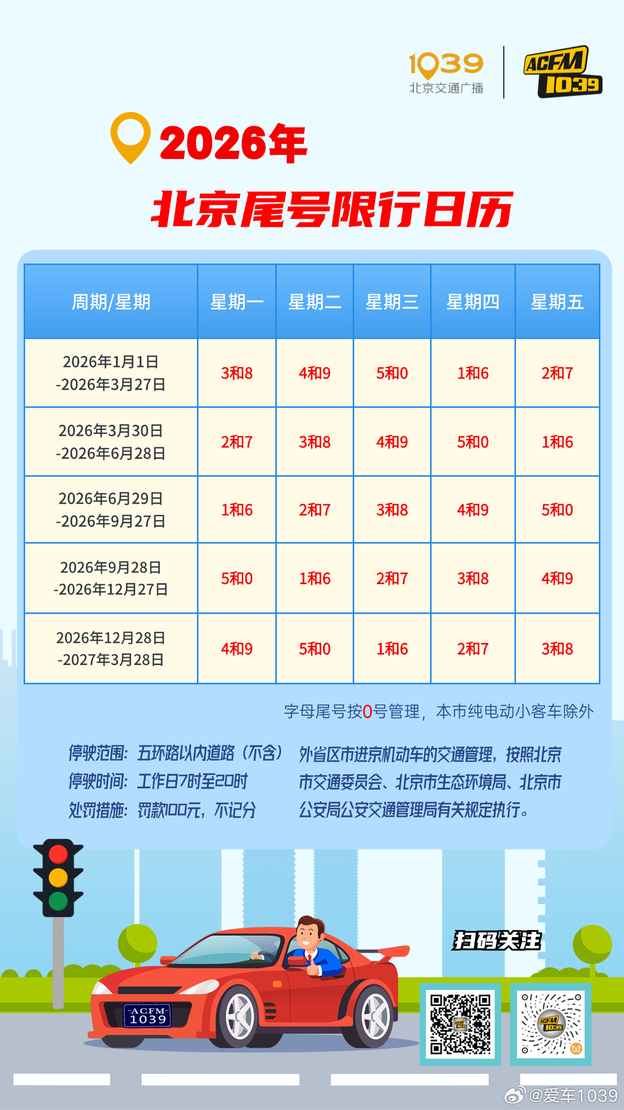 【爱车安全贴士北京尾号限行措施第17次延期 】3月23日,北京市人民政府网站发布关于实施工作日高峰时段区域限行交通管理措施的通告(以下简称通告),北京机动车尾号限行措施将继续实施一年,从2026年3月30日起实施新一轮尾号限行措施。今年,限行的范围、时间、方式均未调整,纯电动小客车将继续不受尾号限行措施限制。北京3月30日起新一轮尾号限行轮换 网页链接