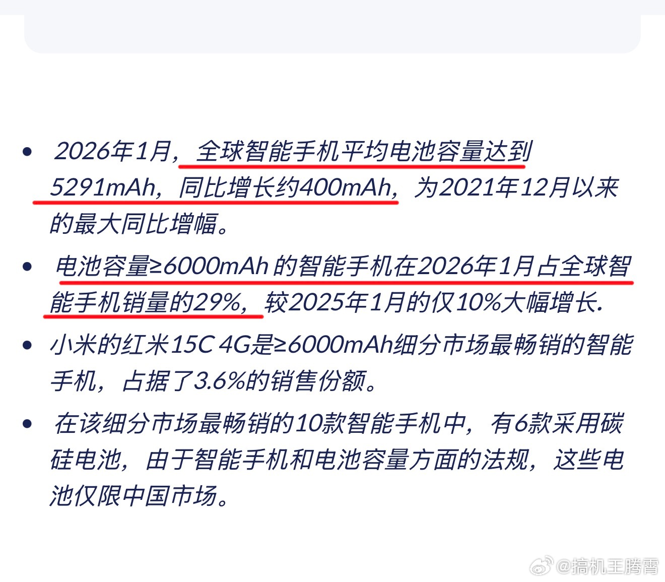 CounterPoint Research最新数据显示,截止2026年1月,全球智能手机平均电池容量达5291mAh,同比增长400mAh,并且1月份全球卖的手机里面,电池大于6000mAh的占了29%,电池大于6000mAh最畅销的手机里面,前十名也都是国产机。这方面咱们确实遥遥领先,比较好奇,你们现在用的手机电池有多大?