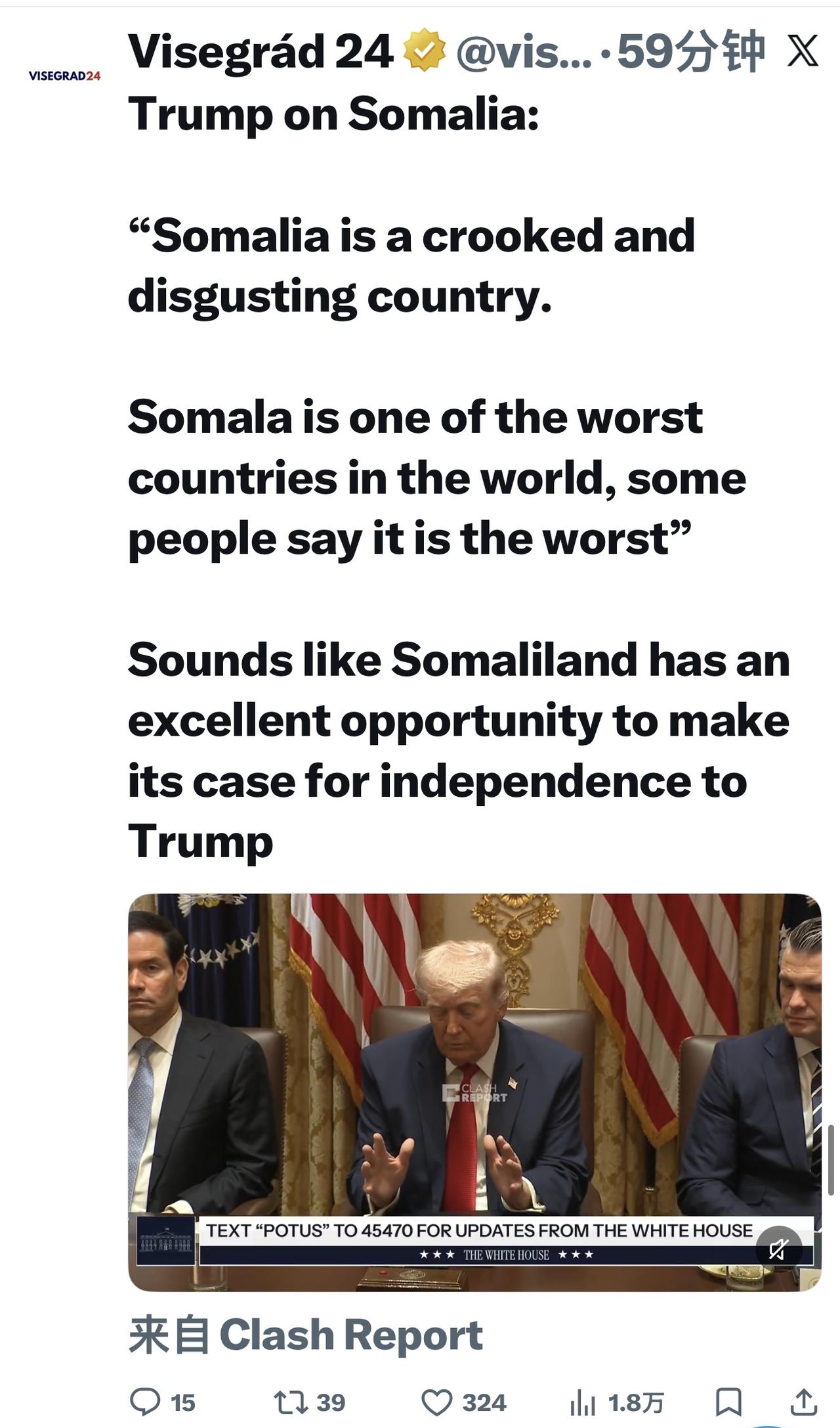 不知所云?特朗普谈索马里: “索马里Somalia是一个腐败堕落、令人作呕的国家。 索马拉Somala是世界上最糟糕的国家之一,有些人甚至说它是最糟糕的。 看来索马里兰Somaliland迎来了一个绝佳的机会,可以向特朗普阐述其独立的理由。”