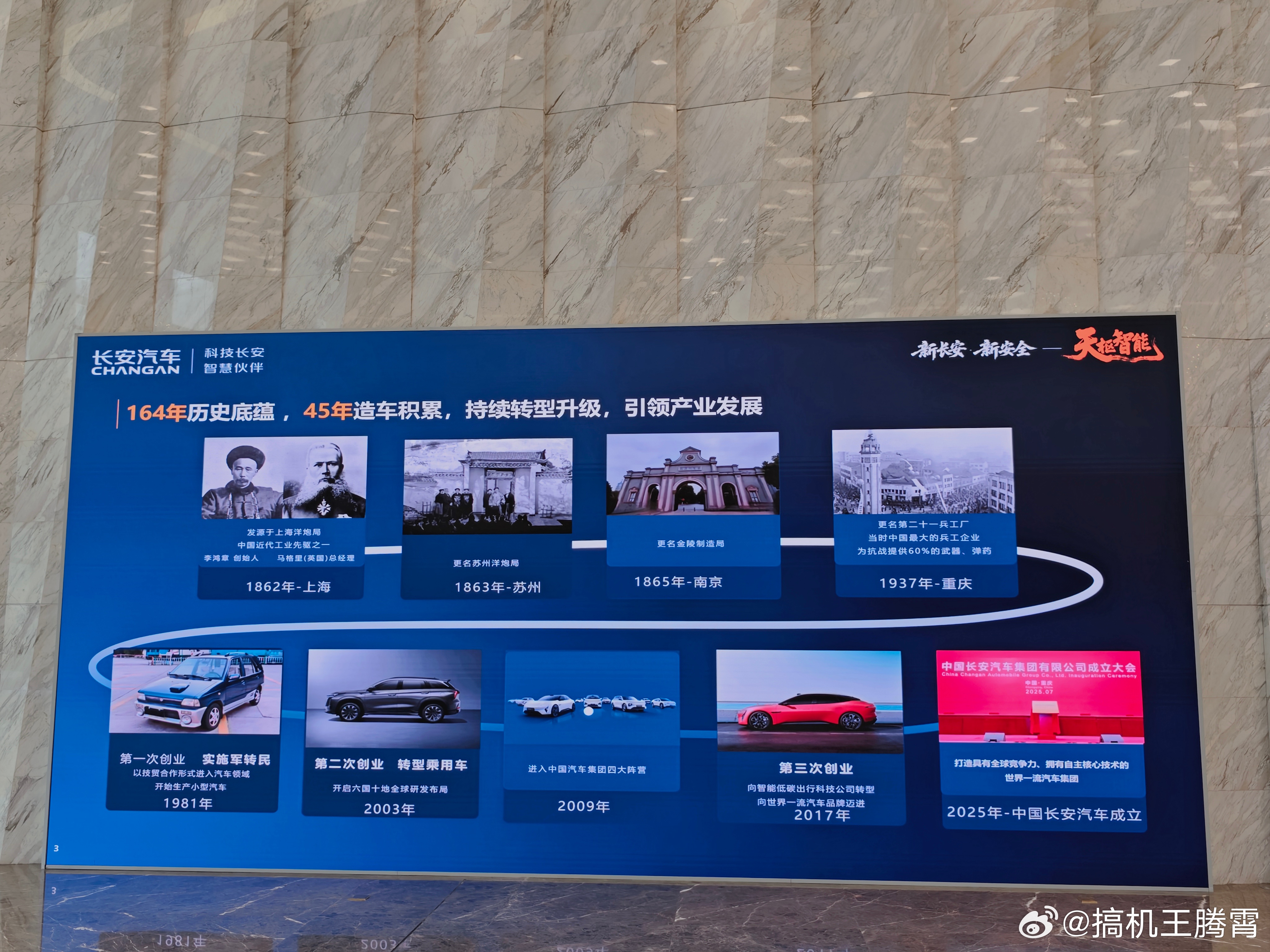 沉浸式体验顶尖电驱下午来长安全球研发中心参观,算是对长安有了全新了解,长安竟然有164年的历史底蕴,涵盖了45年的造车积累,从最初的上海洋炮局到抗战造武器弹药,1981年开始生产的小型汽车,2025年成立中国长安汽车。