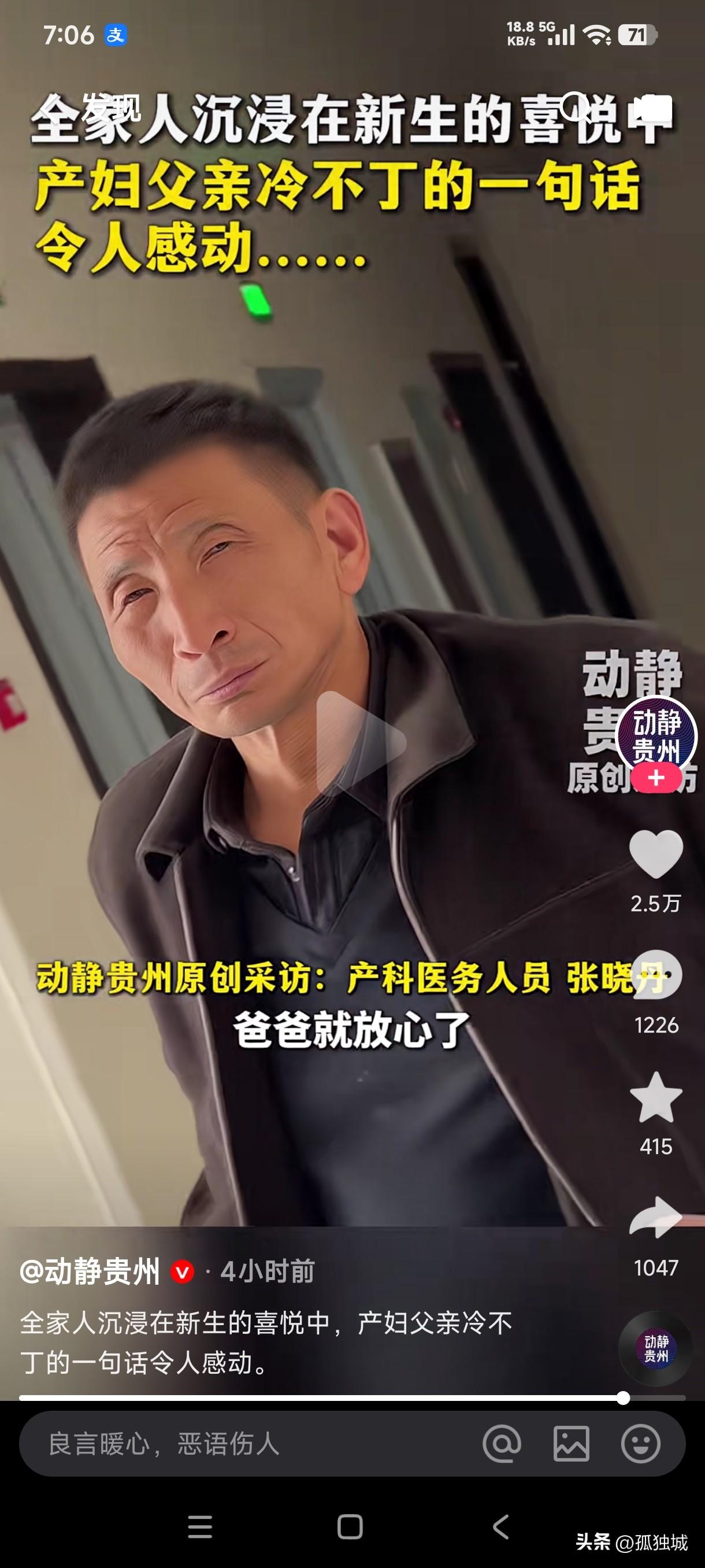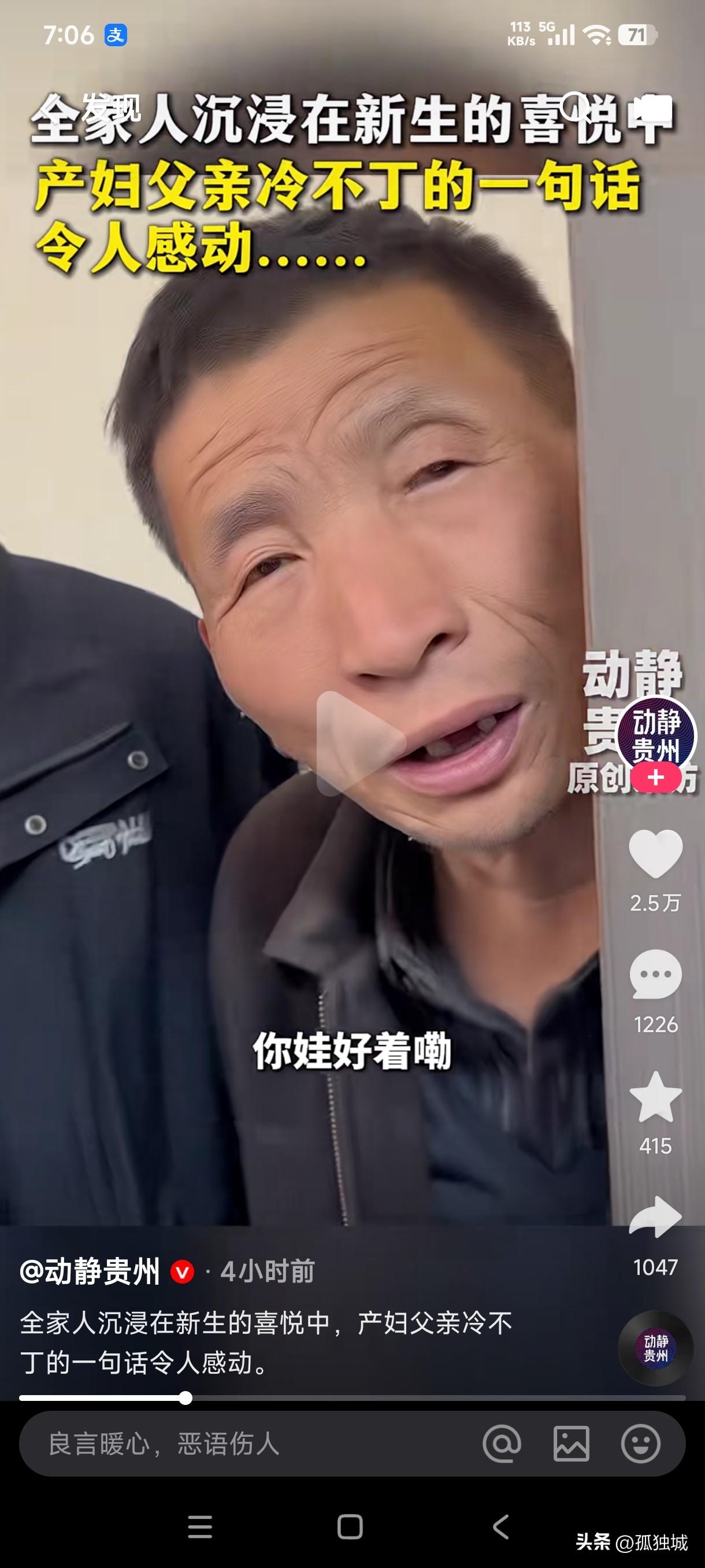 当全家人都沉浸在新生儿的喜悦中时,产妇父亲突然冷不丁的一句话让所有人都感动不已,婆家人都忙着看新生儿,他却问我的娃好着没…… 对于当父亲的人来说,不管到任何时候,无论自己的子女年龄有多大,在父亲的心里她永远都是孩子,这位父亲突然冷不丁的一句我的娃好着没?不知婆家人当时的内心会作何感想?当他看到婆家人都高兴的围着新生儿时,他的孩子却无人问津,他随即问护士他的娃好着没有,当护士对他说,他的娃好着呢,这位父亲悬着的心才放下。 这感人的一幕勾起了多少网友的回忆,当婆家所有人都沉浸在新生儿的幸福喜悦中时,唯独产妇父母心里忐忑不安,不知道自己的孩子怎么样!