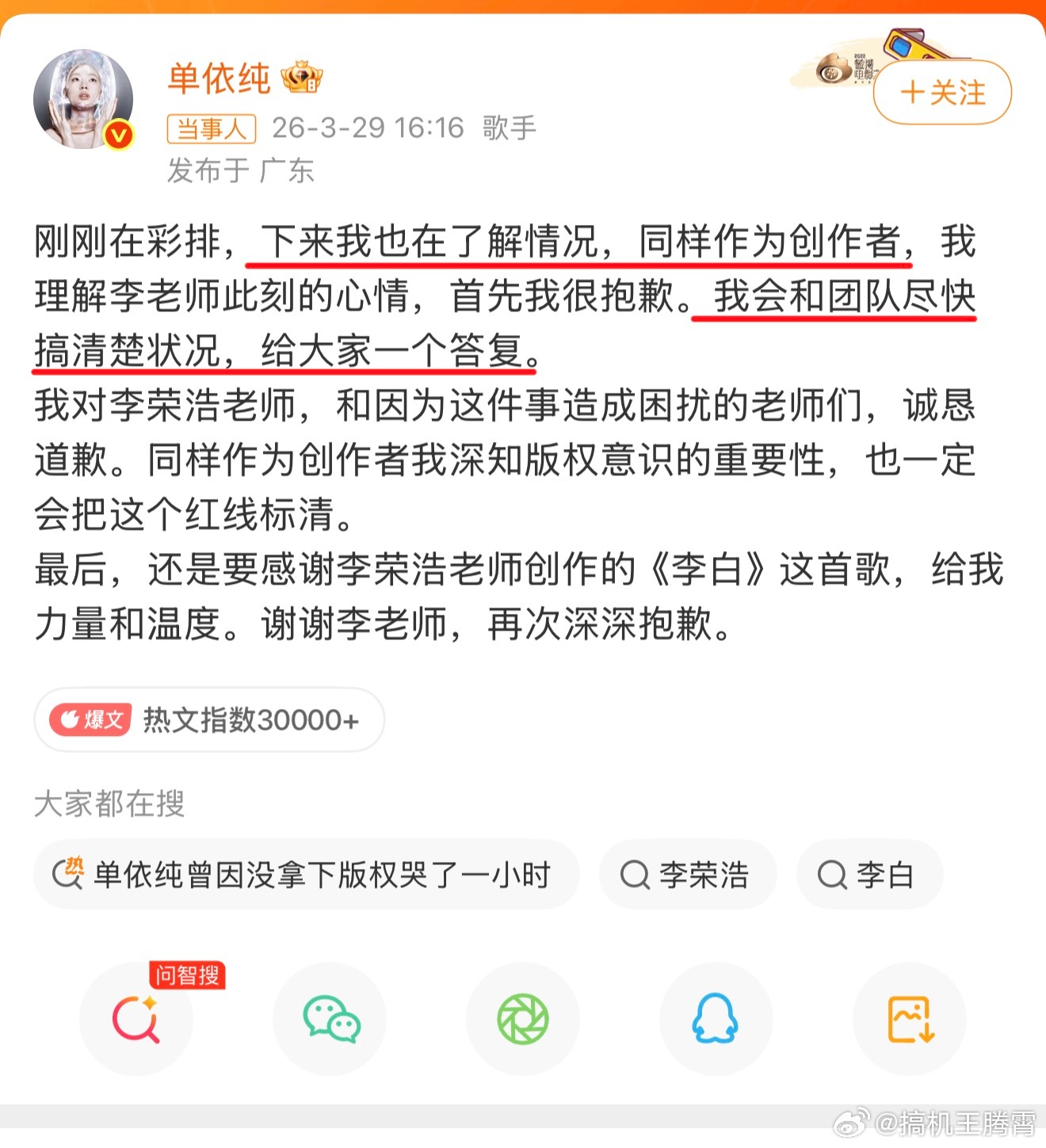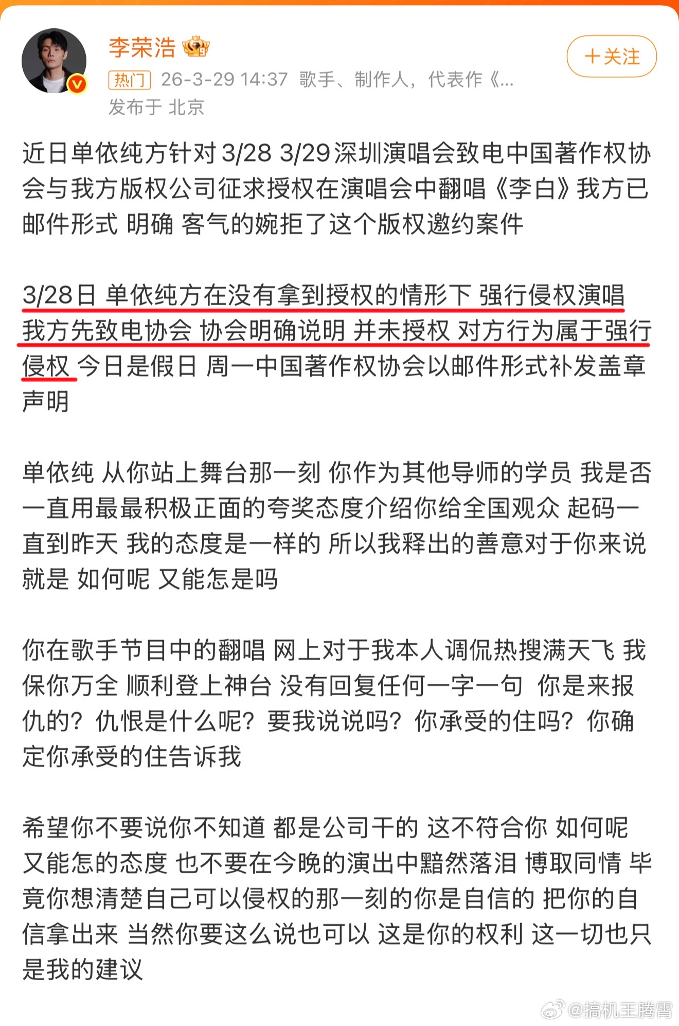 李荣浩 单依纯强行侵权看来李荣浩是真气了,亲自下场开撕单依纯。话说单依纯那么硬气的吗,版权方没授权,音著协也说没授权,她就敢在没拿到授权的情况下强行侵权唱《李白》,要说这事儿她不知道怎么可能呢,目测单依纯确实不占理,不过吧我觉得她翻唱的也并不好听,有同感吗