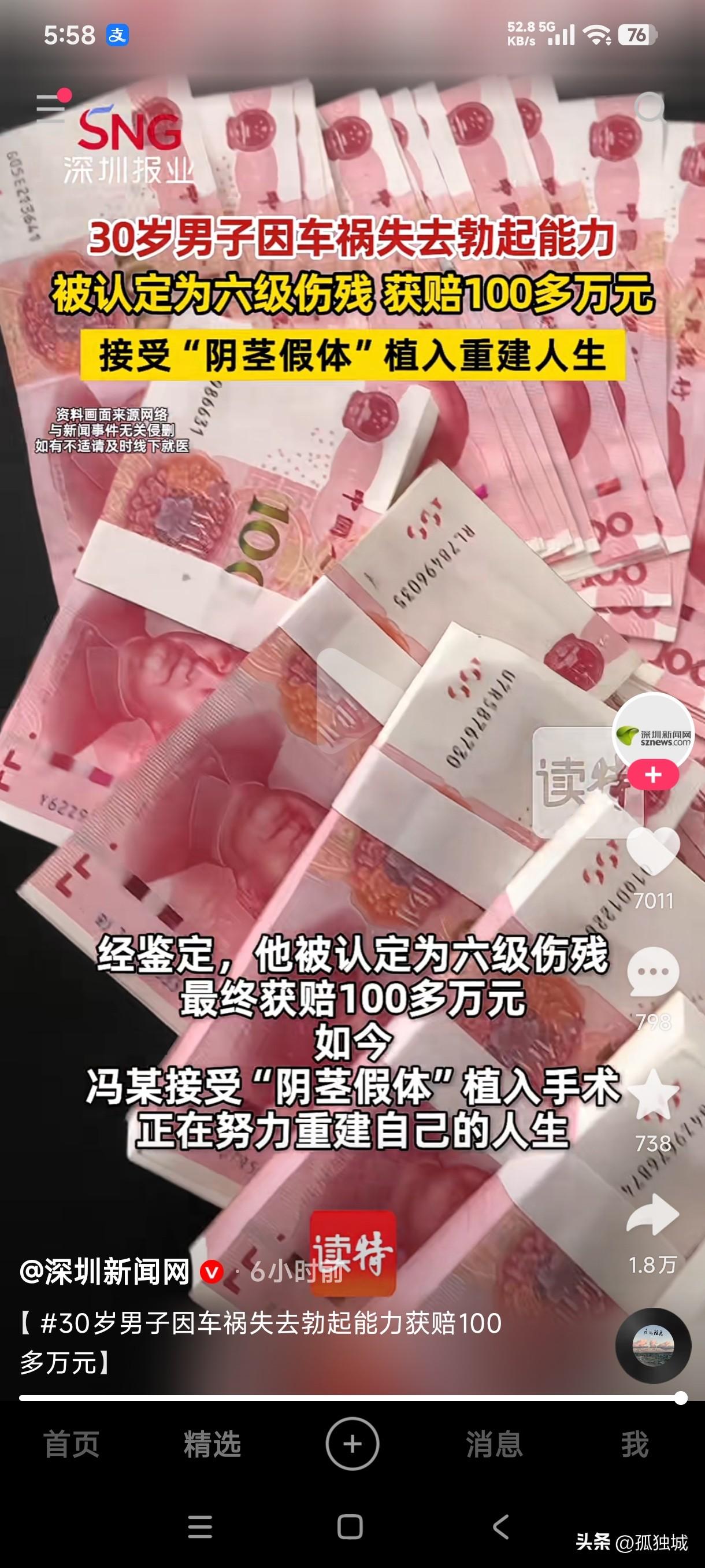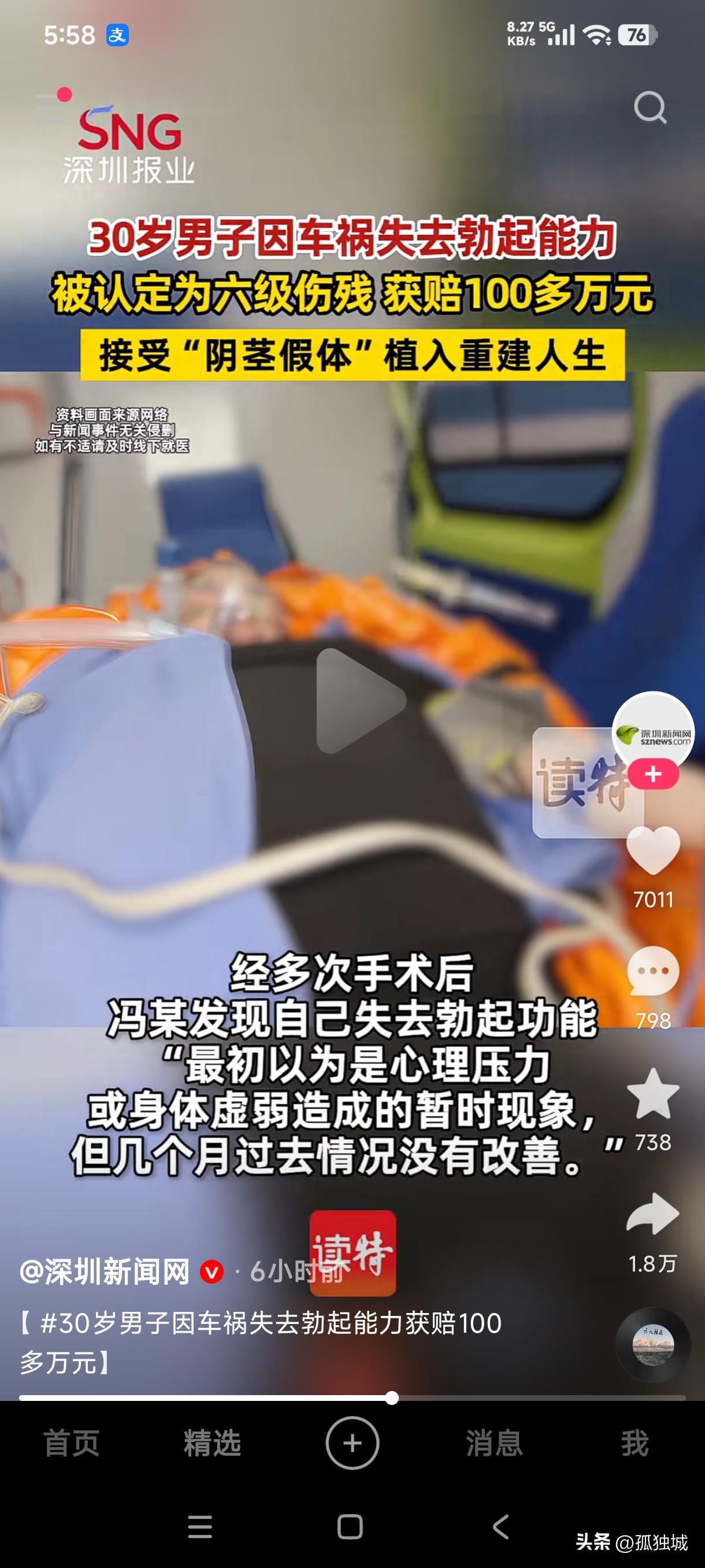 30岁男子因车祸全身多处骨折失去勃起功能,被认定为6级伤残获赔100多万,接受阴茎假体植入重建人生,重新获得男人雄风! 男子因车祸全身多处骨折,多次手术后回家突然发现自己失去勃起功能,最初以为是心理压力太大导致的,几个月后勃起功能还是没有任何变化,于是立即去做了鉴定,鉴定完后被认定是6级伤残,他当即把车主告上了法庭,最后男子获得100多万的赔偿,又给自己植入了阴茎假体,最终重获男人雄风。 这车祸出的是不是让人既羡慕又嫉妒,没想到病情大愈后还获得了100多万赔偿,这100万都有了,还装那假玩意干什么?拿着钱做些自己喜欢的事不好吗?都说食色性也,那玩意就和吃饭一个道理,有些饭不吃也饿不死是不是?这男子天生就是为了那几分钟活着吗?