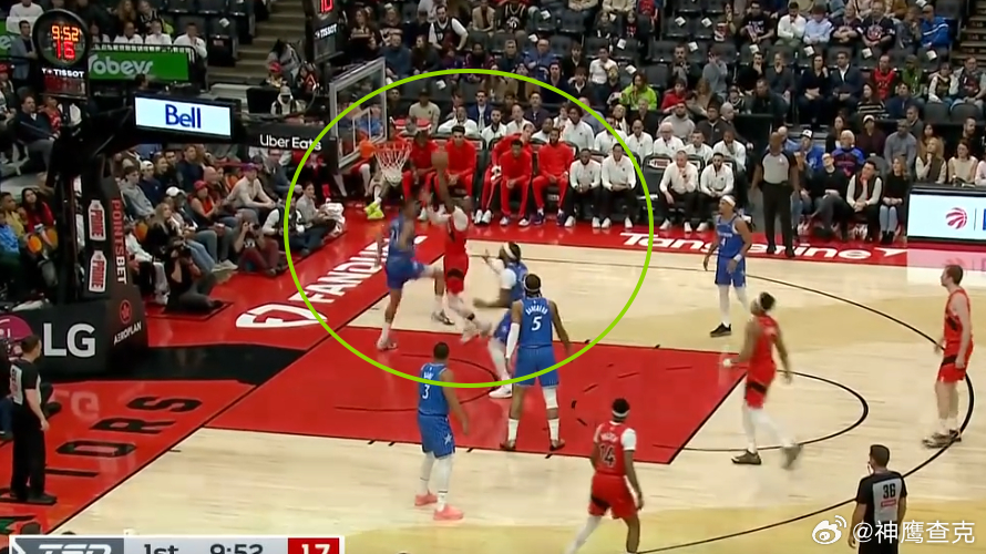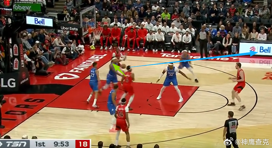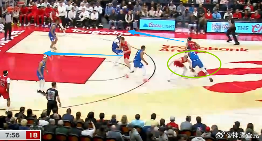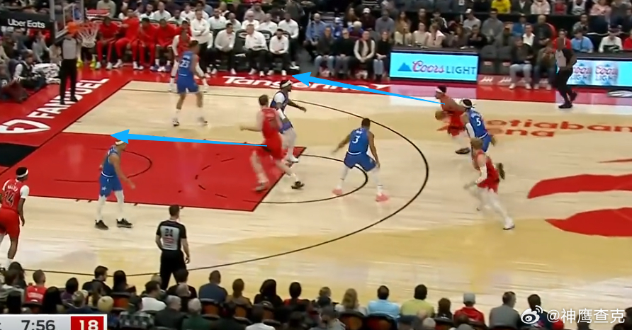 17 18巴恩斯右侧45°空位接球后面对上前扑防的卡特,一个瞄框虚晃+in&out误导启动左路突破直杀篮下,行进间主动发力对抗抗开防守人后衔接上步急停,佯装拔起出手中投吸引萨格斯防守注意力,实则在起跳后空中传球找到无球跑动至右侧45°获得出手空档的迪克,迪克接球三分手起刀落惩罚萨格斯的盯无球走神。