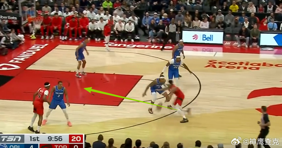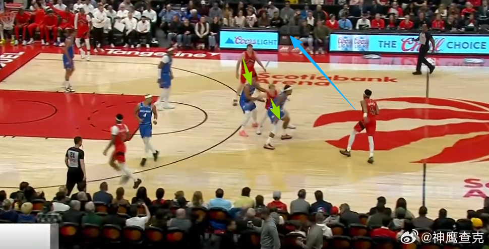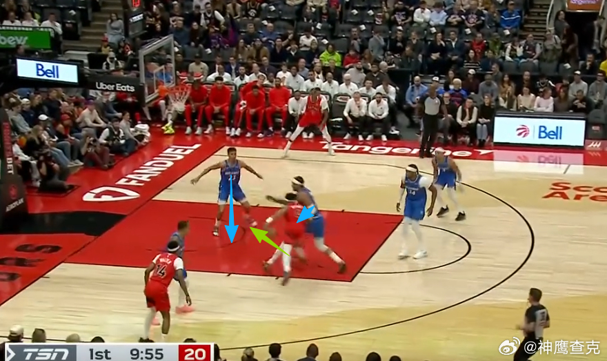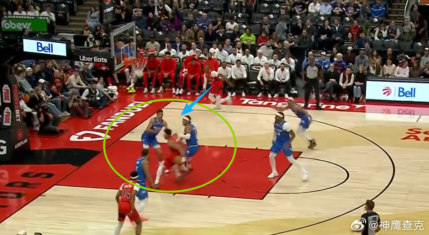 6789 10 11巴恩斯持球推过半场后,立即与迪克、波尔特尔在上线发动“Double Drag”战术。巴恩斯借助迪克扎实的掩护延阻追防的班凯罗后启动右路突破直杀篮下,行进间与波尔特尔进入二打一卡特的优势局面,见沉退的卡特站定位置封堵突破路线,立即出球给篮下空位的波尔特尔,助其终结打进。