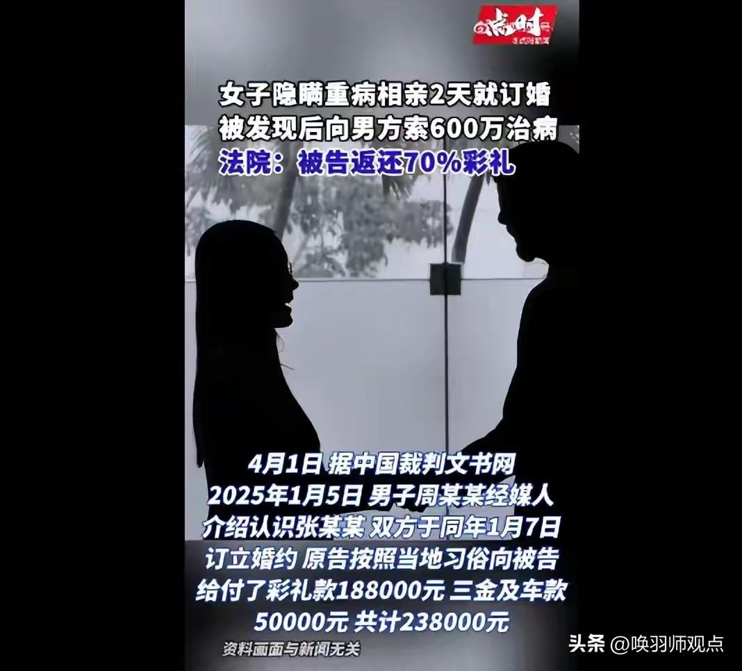 相亲两天闪婚,女方索要600万治病被拒后拉黑!法院判了 近日,一起婚约纠纷案引发热议。男子周先生与张女士相亲两天后闪电订婚,支付23.8万彩礼。婚后,张女士被曝隐瞒尿毒症病史,并要求周先生贷款600万为其治病。被拒后,张女士将周先生拉黑,双方对簿公堂。 法院经审理认为,双方虽未领证但已共同生活,女方隐瞒重大疾病存在过错。最终判决女方返还70%彩礼,即16.66万元。此判决平衡了“共同生活事实”与“过错责任”,既惩戒了隐瞒行为,又未过度加重患病方负担。 唤羽师观点: 闪婚风险高,隐瞒是婚姻的定时炸弹。彩礼应是诚意的体现,而非“救命稻草”或“套现工具”。婚姻的本质是相互扶持,但前提是“坦诚相待”。这场闹剧,给所有“速成”婚姻敲响了警钟。 您觉得法院判返还70%合理吗?如果是您,您会怎么选?评论区见!彩礼反还 婚介骗彩礼 闪婚退彩礼 彩礼打官司 安徽彩礼纠纷 婚恋彩礼协议 2000元彩礼 婚宴拒结款 湖南订婚案 取消订婚仪式 彩礼谈判指南 淄博订婚案 山东淄博订婚案 天价订婚