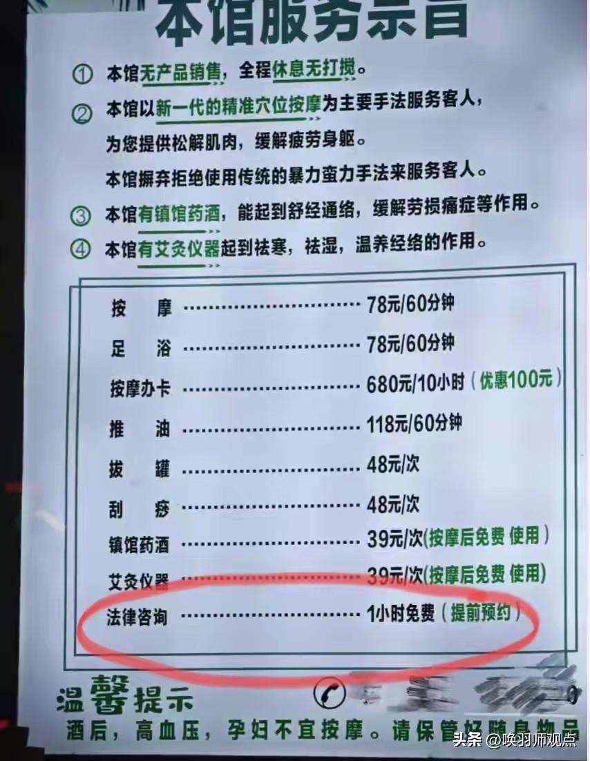 按摩1小时送“免费法律咨询”?差异化竞争吗?这家店火了!网友:太卷了 近日,南宁一按摩店的价目表走红网络,其“法律咨询——1小时免费”的服务引发热议。店家回应称,需先消费按摩项目,才能在按摩过程中由“老板亲属”提供咨询。此举被网友戏称为“跨界天花板”,但也遭质疑:按摩店能提供法律咨询吗? 法律界人士指出,提供法律咨询的主体需具备相应资质,非执业律师提供此类服务涉嫌违规。同时,市场监管部门也表示将介入核查。 唤羽师观点: 服务创新值得鼓励,但跨界不能越界。法律咨询事关重大,绝非谁都能“顺手”为之。商家与其在“专业雷区”上动脑筋,不如踏踏实实提升主业。消费者也需擦亮双眼,遇法律问题,务必寻求正规渠道。 您觉得这种“按摩+普法”的跨界服务靠谱吗?如果是您,您会尝试吗?评论区见!养生店按摩 按摩行业黑幕 按摩价格表 理疗店按摩 象泰按摩 按摩维权 24小时按摩馆 南宁按摩培训 上门按摩纠纷 按摩宣传单 青秀按摩 按摩自助不限量 岚泰按摩 常和堂按摩 江滨路按摩