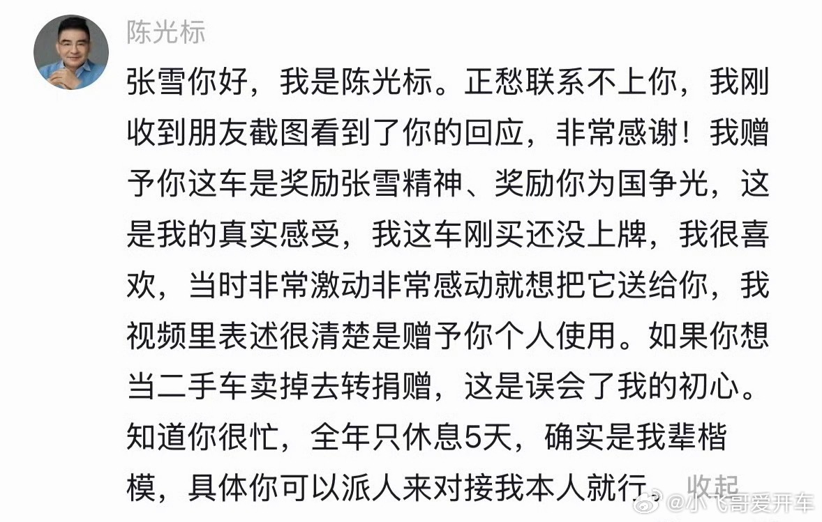 张雪想卖陈光标赠送豪车给嫣然捐款陈光标说要赠给张雪一辆劳斯莱斯幻影,然后张雪回复了,你要真送我这车我会立即以八折价格转售给二手车商,并将全部所得款项捐赠给嫣然天使基金。