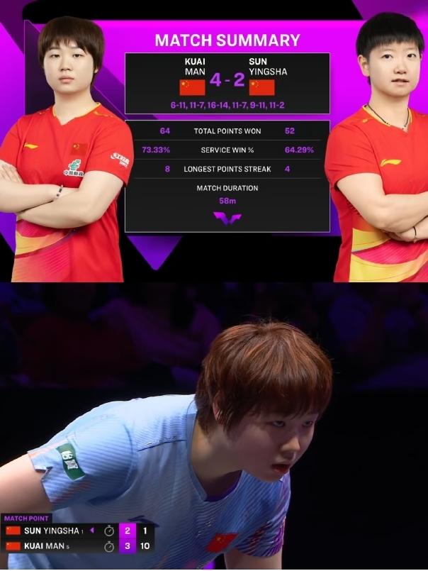 头条体育热点|孙颖莎4-2逆转蒯曼,国乒内战上演翻盘好戏 国乒女单内战再出经典!今日,孙颖莎与蒯曼展开强强对决,面对开局2-7的落后局面,莎莎迅速调整状态,凭借凌厉的进攻与细腻的台内控制,连追分数实现翻盘,最终以4-2拿下胜利,强势晋级! 这场比赛堪称今日乒坛焦点,孙颖莎展现出顶尖选手的抗压能力与大赛经验,蒯曼也同样敢打敢拼,奉献了多回合精彩对拉。值得一提的是,国乒女单另有选手在此前赛事中遗憾出局,孙颖莎的这场胜利,也为球队稳住了士气。 作为国乒核心主力,孙颖莎近期状态持续在线,无论是国际赛场还是队内内战,都展现出极强的竞争力。接下来,她将继续向赛事冠军发起冲击,能否延续火热手感?让我们一起期待!体育热点 乒乓球赛事