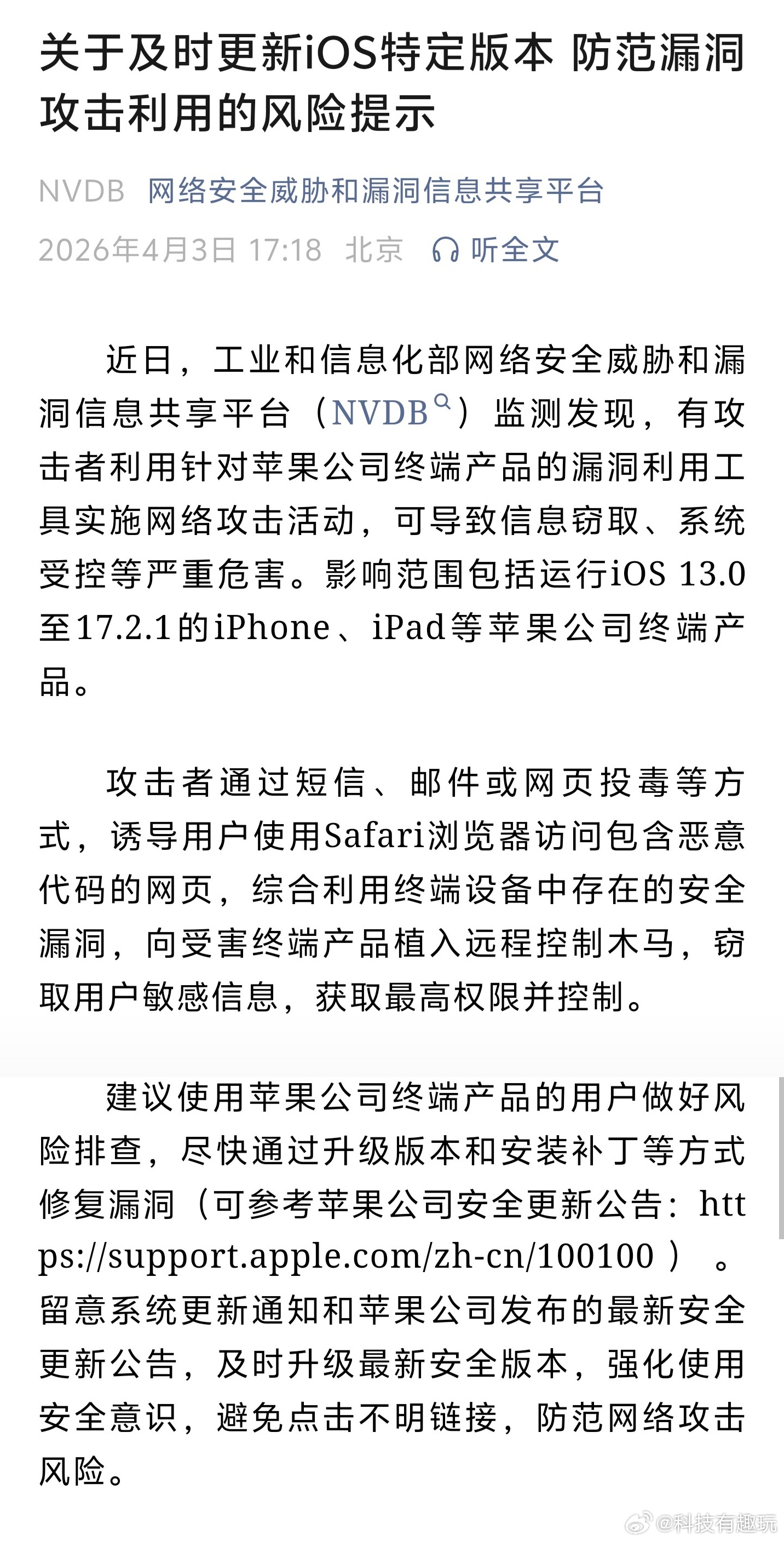 工信部紧急提醒苹果用户看了下会影响iOS 13.0–17.2.1几乎所有iPhone、iPad,只要用Safari点开恶意网页,无需安装、无需授权,手机就会被控制,还停留在旧系统的,重点注意!👉 立刻升级最新系统👉 陌生链接一律不点👉 Safari 别乱开陌生网页