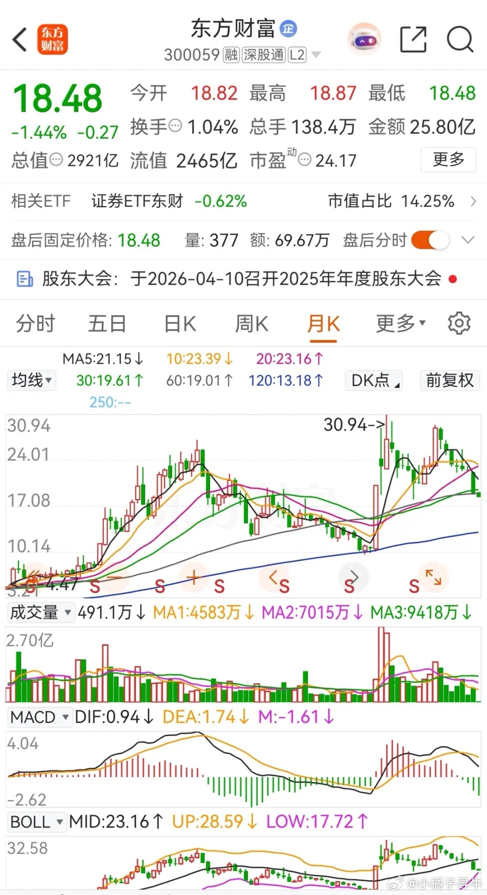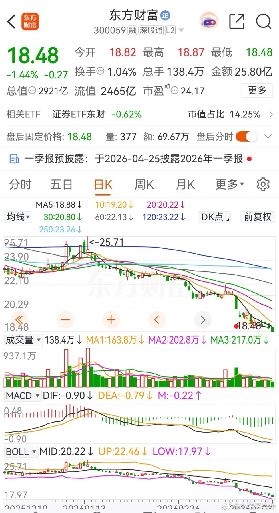 东方财富高开低走,收盘价和最低价再创本轮调整新低,在2026年的累计跌幅更是达到了20.28%。券茅东方财富今天小幅高开后走低,最终以最低价收盘报收,全天的跌幅为1.44%,报价为18.48元。在资金流向上,今天被主力资金净卖出了4.4176亿元,本周的合计净卖出金额约为16.5217亿元。