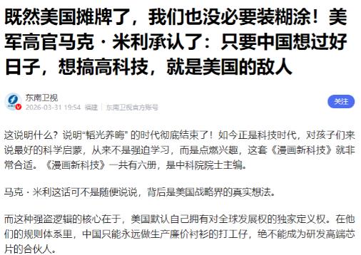 既然美国摊牌了,我们也没必要装糊涂!据媒体3月31日报道:美军高官马克・米利曾表示:只要中国想过好日子,想搞高科技,就是美国的敌人。 说这话的马克·米利,绝非美军体系里的普通角色。他曾担任美军参谋长联席会议主席,是美国武装力量的最高级别军官之一,更是总统和国家安全委员会的核心军事顾问。这样一位手握过美军实际指挥权的高层,公开抛出如此直白的论调,本质上已经撕掉了美方长期以来试图维持的虚伪面纱。 这番言论根本不是一时兴起的随口表态。它精准暴露了美国对华战略的核心逻辑。我们国家追求更好的生活质量,是14亿人民的正当权利。我们发力高科技领域,是为了摆脱对外依赖,保障国家发展安全。这些完全符合人类共同发展规律的诉求,在美方眼中竟然成了威胁。 美方的做法已经给出了最直接的印证。他们动用国家力量打压华为等中国高科技企业。他们出台芯片法案,限制高端半导体技术和产品对华出口。他们联合盟友构建技术封锁网络,试图遏制中国在人工智能、量子计算等前沿领域的探索。这一系列操作,与米利的言论形成了完美呼应。 米利的表述,其实是美国精英阶层零和思维的集中体现。他们习惯了占据全球产业链顶端的特权,不愿看到其他国家通过努力实现赶超。他们将自身霸权地位的维护,建立在限制他国发展权的基础上。这种逻辑已经违背了全球化时代的发展潮流。 我们国家从未将美国视为敌人。我国国防部早就明确表态,中国国防和军队的建设发展,完全是出于维护国家主权、安全、发展利益的需要,不针对任何国家。我们在科技领域的每一步突破,都是无数科研工作者艰苦奋斗的成果。我们改善民生的每一项举措,都是为了让人民过上更幸福的生活。 这些发展成就不是威胁。它们带来的是全球产业链的丰富和完善,是人类科技进步的共同财富。中国在新能源、5G等领域的技术突破,已经为世界各国提供了更多发展机遇。这种共赢共享的发展模式,与美方的霸权思维形成了鲜明对比。 米利作为曾深度参与美国国家安全决策的军方高层,他的言论绝非个人观点。它反映出美国对华战略已经进入全面摊牌的新阶段。过去美方还会用“竞争”“规则”等话术进行包装。现在他们连伪装都懒得维持,直接将中国的发展权定义为对其霸权的挑战。 我们没必要再抱有幻想。这种幻想曾让一些人认为可以通过妥协换取和平发展空间。现实却一次次证明,美方的遏制不会因为我们的克制而放松。从限制人才交流到阻挠企业合作,从技术封锁到舆论抹黑,美方的打压从未停止。 我们的回应必须清醒而坚定。继续聚焦自身发展是核心。我们要持续加大科技研发投入,攻克“卡脖子”技术难题。2024年我国每天生产约12.4亿颗芯片的成就,已经证明了自主创新的力量。华为鸿蒙系统突破8亿装机量,更彰显了中国企业的韧性。 我们要坚定维护自身正当权益。对于美方的不合理打压,中国具备充足的政策准备与应对手段。我们不会主动挑起冲突,但也绝不允许自身发展权被肆意剥夺。对等反制不是目的,而是捍卫公平正义的必要手段。 14亿人追求美好生活的愿望,是任何力量都无法阻挡的。我们国家拥有庞大的市场规模、完整的工业体系和源源不断的人才储备。这些优势共同构成了我们应对挑战的底气。 米利的言论虽然刺耳,却让我们更加认清了现实。它让我们彻底放弃了不切实际的幻想,也让我们更加团结。美国的摊牌,反而倒逼我们加快了自主发展的步伐。 历史终将证明,霸权逻辑注定无法持久。合作共赢才是时代的主流。中国的发展不会因为美方的遏制而停滞。我们会沿着自己选择的道路坚定前行,用实实在在的发展成果回应所有不合理的指责。 既然美方已经把话说透,我们就更要保持清醒。丢掉幻想,准备斗争,不是要主动寻求对抗。而是要在复杂的国际环境中,牢牢掌握发展的主动权。我们的目标从来不是取代谁,而是成为更好的自己。这种坚定的信念,会支撑我们走过所有风雨,迎来更光明的未来。