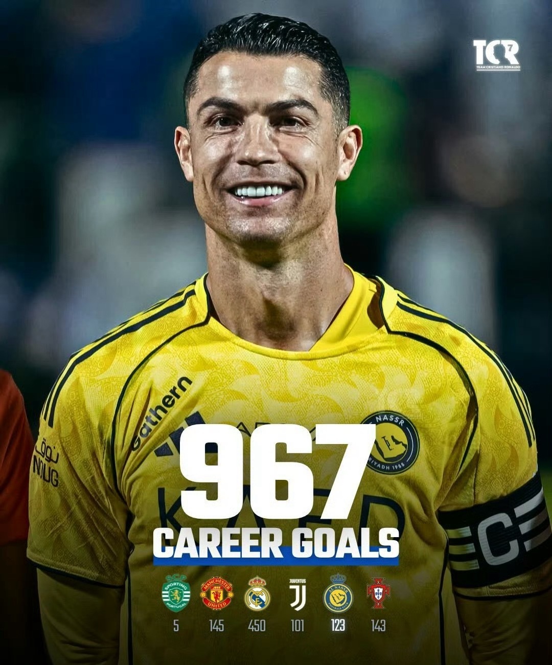 沙特联第27轮,利雅得胜利5:2大胜纳杰马体育。球王C罗伤愈复出上演梅开二度!总进球数来到967球!(梅西902球紧随其后)