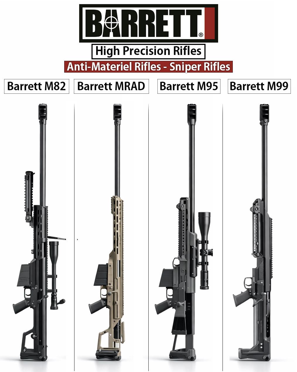说到大口径反器材狙击枪,绕不开的绝对是巴雷特(Barrett) 这个名字。图中这四款,就是巴雷特家族最具代表性的 “四大金刚”,今天用大白话给大家讲明白每把枪的特点和定位。 🔫 1. 巴雷特 M82:反器材狙击枪的 “开山鼻祖” M82 是巴雷特的成名作,也是全世界最知名的大口径狙击枪,堪称 “反器材枪的标杆”。 核心定位:半自动、12.7×99mm 大口径,主打远距离反器材,能打穿轻型装甲车、雷达站、油库等目标,也能远距离狙杀人员。 核心优势:半自动射击,打完一发不用手动拉栓,连续作战能力强;可快速拆解,方便携带;后坐力控制优秀,是美军正式列装的型号(M82A1/M107)。 经典名场面:阿富汗、伊拉克战场的 “千里之外打穿掩体”,无数影视游戏里的 “大炮狙” 原型。 🔫 2. 巴雷特 MRAD:现代模块化 “多面手” MRAD 是巴雷特的新一代明星,主打模块化、多口径、高精度,是专门为现代特种作战设计的型号。 核心亮点:可以快速更换枪管,切换.338 Lapua、.300 Win Mag、7.62×51mm 等多种口径,一把枪就能覆盖从远距离狙杀到反器材的全场景需求。 设计优势:折叠枪托、轻量化设计、人机工学拉满,适合特战部队快速部署;精度比 M82 更高,兼顾反器材和远距离人员狙杀。 定位:传统 M82 的 “现代化升级版”,更灵活、更精准,是目前巴雷特的主力外销型号。 🔫 3. 巴雷特 M95:栓动轻量化 “便携款” M95 是 M82 的栓动改进版,主打极致轻量化、便携性,专门为需要单兵携带、快速机动的部队设计。 核心特点:手动栓动结构,去掉了半自动的复杂机构,重量比 M82 轻了近 2 公斤,长度更短,方便单兵背负、空降作战。 优势:结构简单可靠,维护成本低;栓动结构带来更高的射击精度,适合远距离精准反器材。 定位:M82 的 “轻量化栓动版”,牺牲了半自动射速,换来了极致的便携性,适合特种部队、侦察兵使用。 🔫 4. 巴雷特 M99:单发栓动 “精度天花板” M99 是巴雷特家族里的 “精度王者”,主打极致远距离、超高精度,是专门为超远距离狙击设计的型号。 核心特点:单发栓动、无弹匣设计,打一发装一发,结构极致简单,最大限度减少机械误差,精度拉满。 优势:枪管浮置设计,完全不接触护木,射击精度远超 M82/M95;可以发射超长径比的高精度弹药,有效射程轻松突破 2000 米。 定位:专业级超远距离反器材 / 狙击枪,适合专业狙击手执行超远距离精准打击任务,是巴雷特家族里的 “精度天花板”。