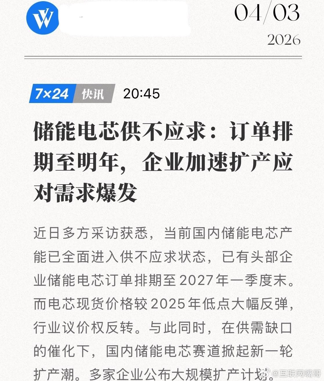 供需彻底反转!储能电芯“供不应求”,订单排到2027年!2026年4月,储能行业迎来卖方市场的强势回归!大厂订单已排到2027年——这是当前储能电芯市场的真实写照。头部企业产线满负荷运转,系统集成商甚至不惜预付现金锁产能,只为确保交付。2025年,储能电芯价格一度跌至0.24元/Wh,而如今,0.37-0.38元/Wh的报价都“一芯难求”,涨幅超60%。行业议价权彻底反转,从买方市场迈入卖方市场。这背后,是全球需求的集中爆发!欧洲多国大储市场全面起量,美国受AIDC算力中心建设驱动,澳大利亚补贴政策刺激需求激增。更关键的是,中国自2026年4月起逐步取消电池出口退税,全球90%的储能电芯由中国供应,引发海外项目抢装潮,供应链需求短期集中爆发。面对“一芯难求”,企业纷纷加速扩产!大厂纷纷公布大容量电芯新产线计划,2026年或将成为大电芯投产密集期。