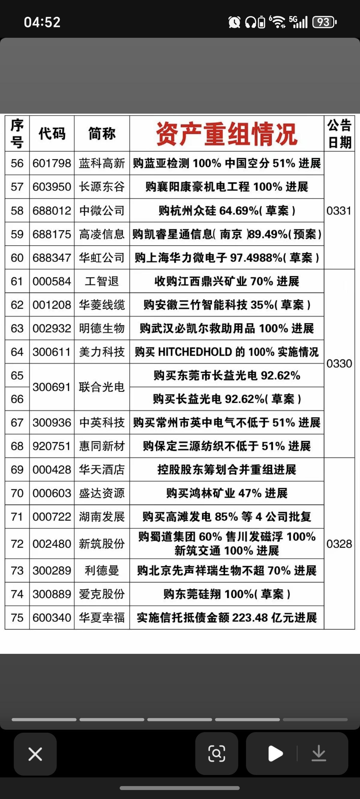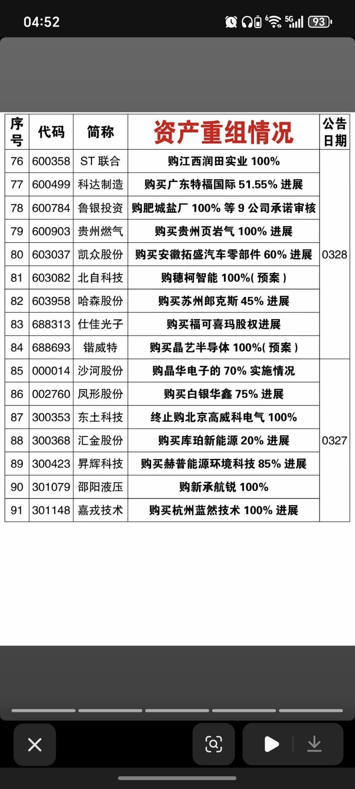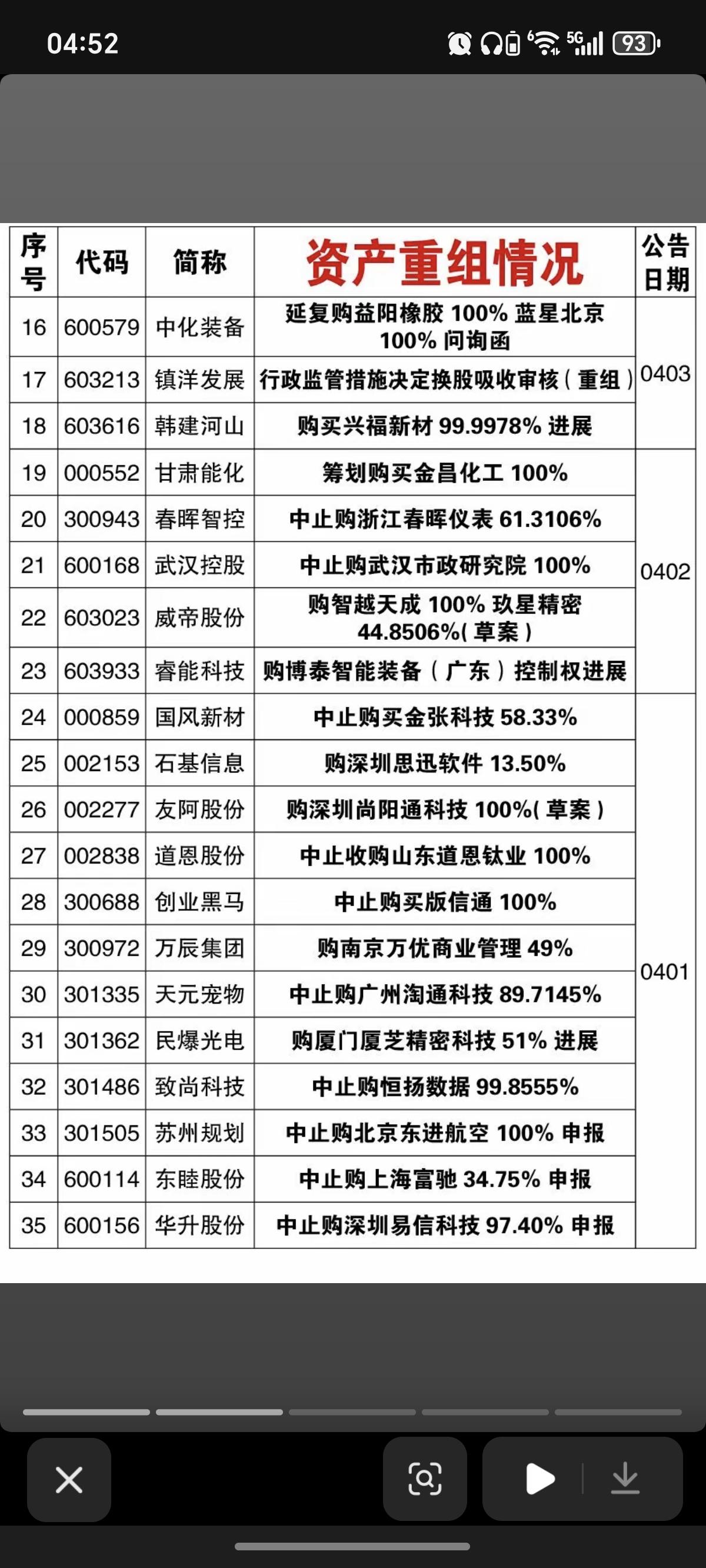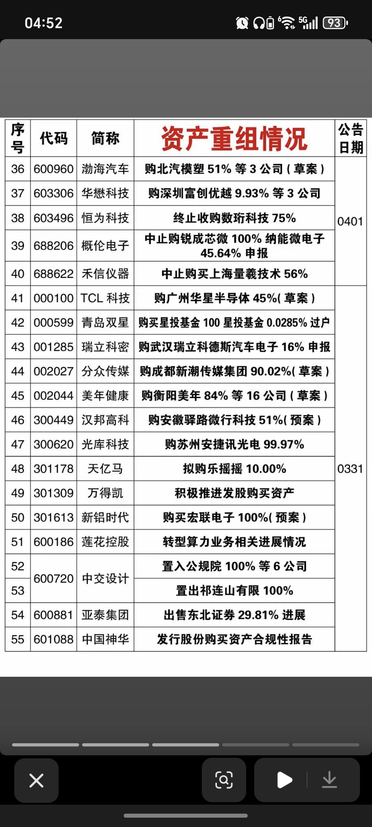 4.5周日 本周91家公司资产重组! 本周91家公司公告资产重组进展,有部分终止,短期回避。 能够资产重组成功的,往往蕴藏着一定的机会。