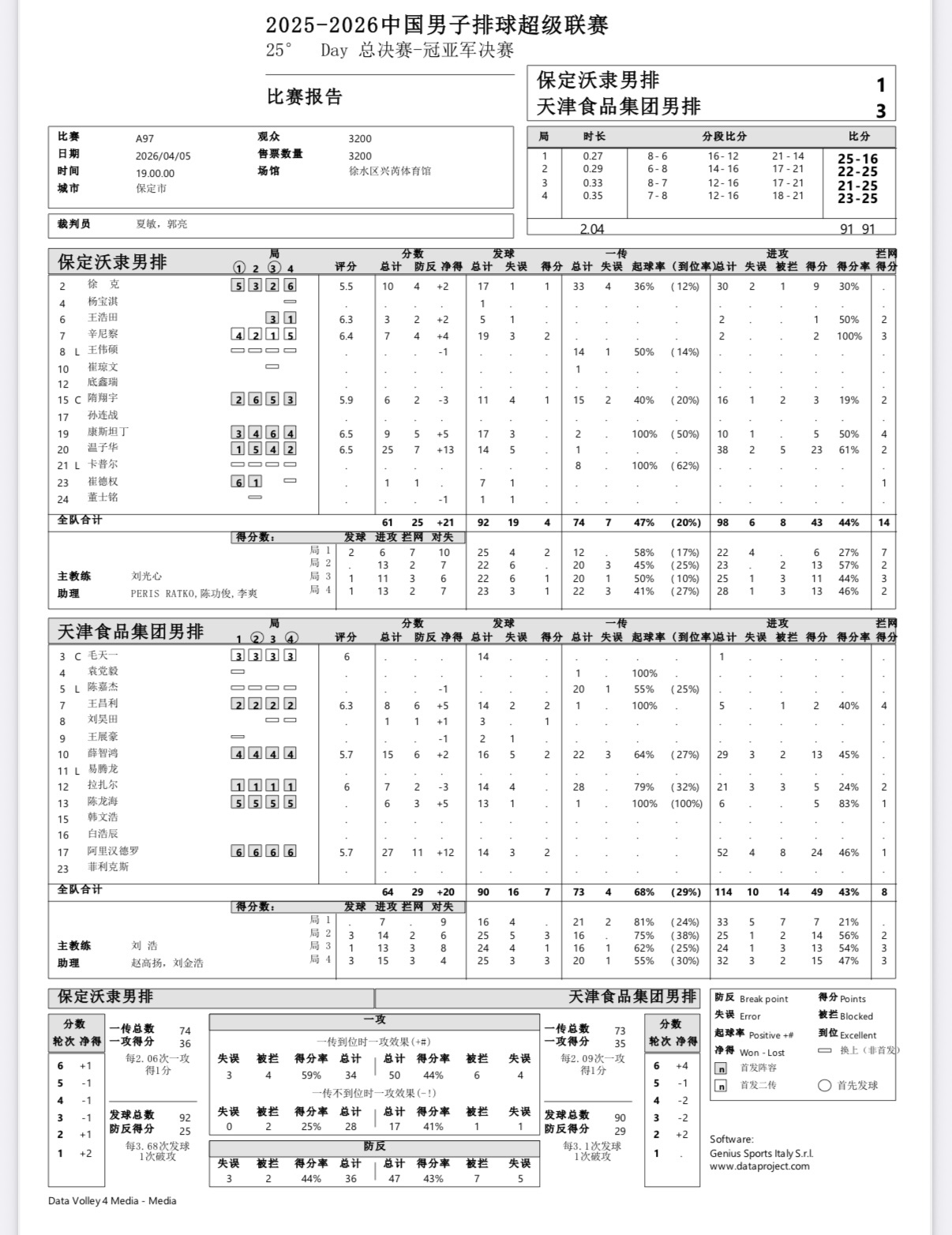 2025-2026中国男排超级联赛 男排联赛总决赛第三回合决胜局较量:河北保定男排1-3遭遇天津男排逆转(25-16,22-25,21-25,23-25)。温子华25分难救主!温子华25分(38扣23中2失误5被拦,2拦),徐克10分(30扣9中2失误1被拦,1发,33个一传4失误12%到位率,17个发球1失误),帕纳申卡9分(10扣5中1失误,4拦),西尼西亚7分(2扣2中,3拦2发),隋翔宇6分(16扣3中1失误2被拦,2拦1发,15个一传2失误,20%到位率,11次发球4次失误),王浩田3分,崔德权1分。🇨🇺罗德里格斯27分(52扣24中4失误8被拦,1拦2发),薛智鸿15分(29扣13中3失误2被拦,22个一传3失误,27%到位率,16次发球5失误),王昌利8分(5扣2中1被拦,4拦2发),西罗维奇7分(21扣5中3失误3被拦,2拦,28个一传32%到位率),陈龙海6分(6扣5中,1拦),刘昊田1分。扣球43-49,拦网14-8,发球4-7自失27-30。