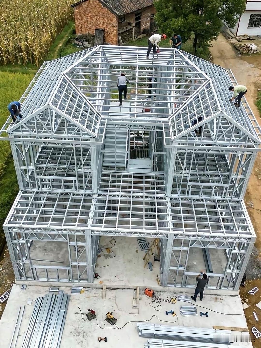 这是冷弯薄壁轻钢结构别墅,是农村自建房的热门替代方案,为什么农村越来越多人选它? 1. 施工快:不用等水泥凝固、不用砌砖,适合想快速入住的家庭 2. 造型灵活:轻钢易加工,大挑檐、坡屋顶、复杂造型都能轻松实现,满足农村建房的“颜值需求” 3. 抗震抗风:适合地震、台风多发地区,安全性远超砖混 4. 政策友好:多地将其纳入绿色农房示范,有每平米100-300元的建房补贴 5. 居住舒适:隔音、保温、防潮性能全面优于传统砖混,冬暖夏凉