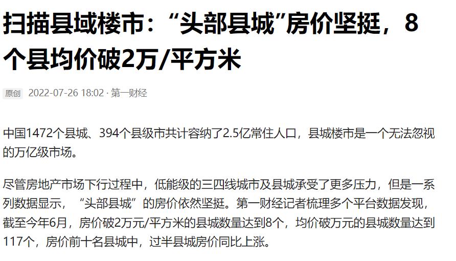 不能在大城市有一个自己的家,现在连回乡“养老”的愿望都要破灭了吗? 全国经济形势不容乐观,房价却仍在上涨,如今小县城的房子都要买不起了。 中国1472个县城、394个县级市,加起来1800多个,里面有100多个房价都超过了1万以上。不过县城的房价突破2万,多少让人有些吃惊,甚至还有超3万的。这么高的房价,你还会选择去小县城买房吗?