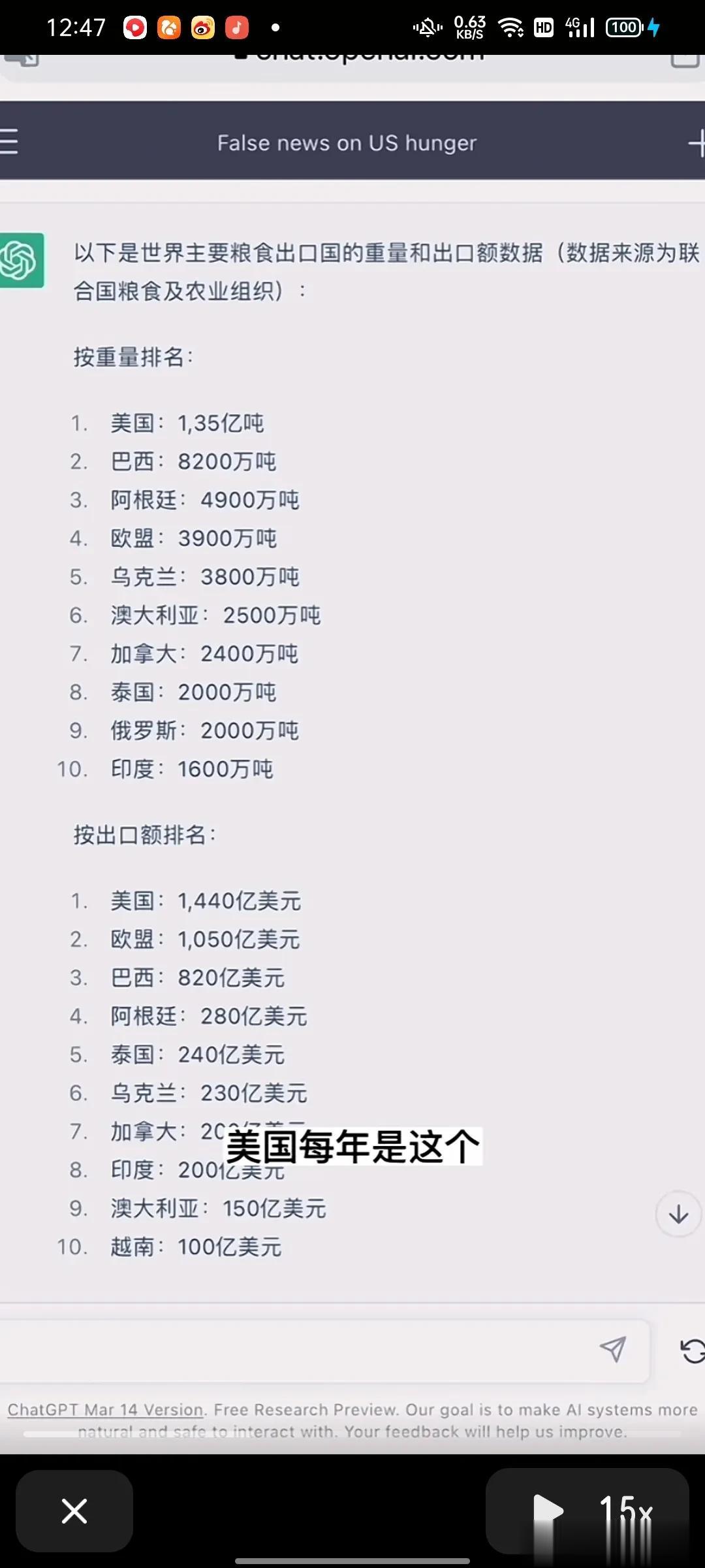美国出口1.35亿吨粮食,也就是2700亿斤粮食,美国总共3亿人,平均900斤/人/年,换算每天2.46斤/人,正常换算这些粮食最少还能养活8亿人,美国政府太可恶了,这么多粮食出口都不给国民吃饱饭,万恶的资本主义国家🙄