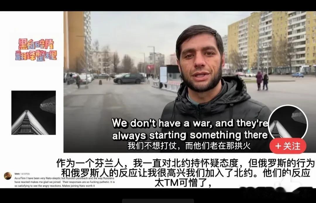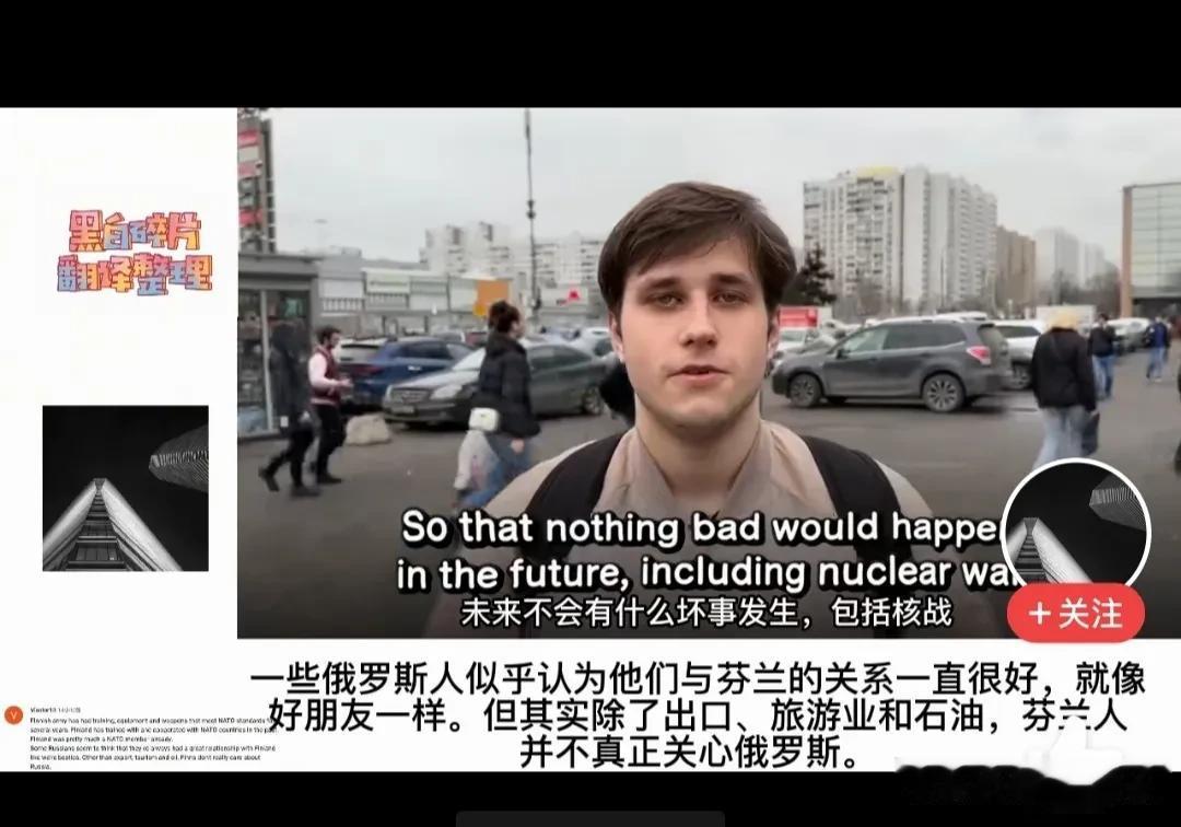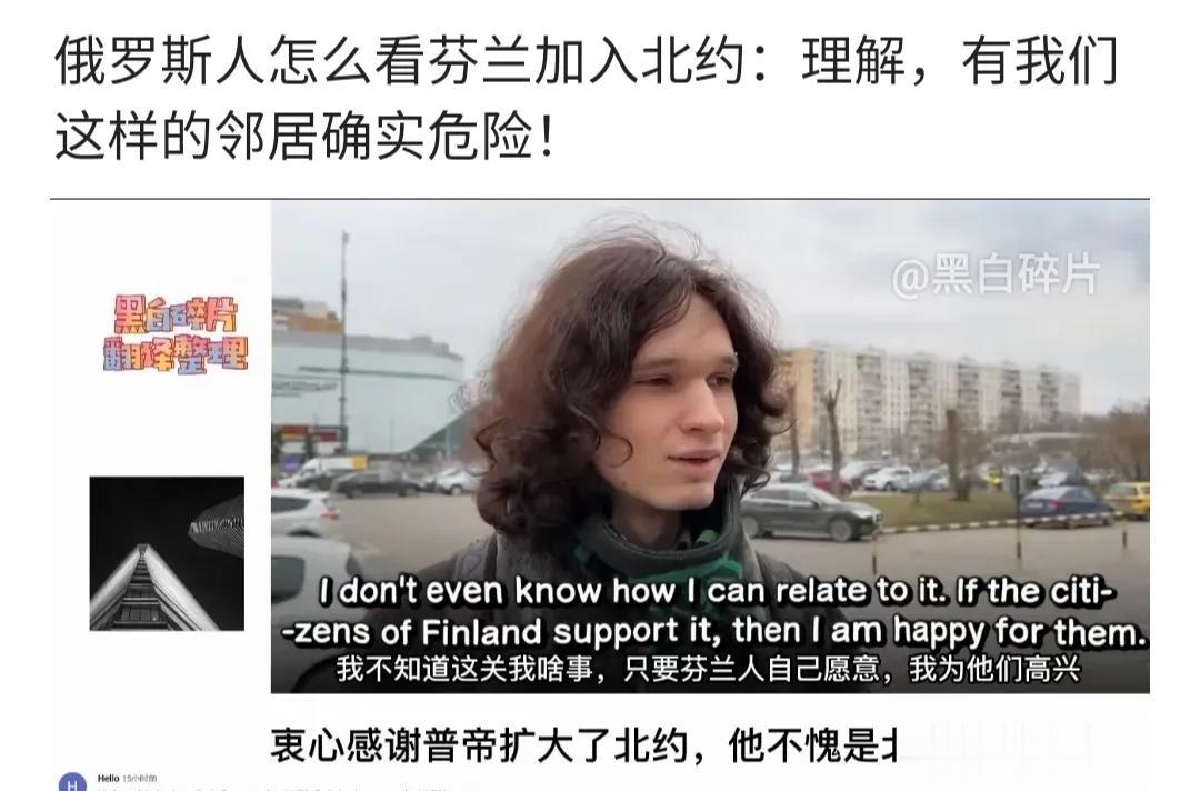 芬兰4月4日正式加入北约,俄罗斯人是如何看芬兰加入北约的。 芬兰和俄罗斯1200公里的边界线未来俄罗斯和北约军事上的角力将会增强。 对于芬兰加入北约,记者俄罗斯街头采访。 a、因为对他们来说,有像我们这样邻居挺危险。 b、说实话,我态度保持中立,这是各国自己的事,我开普帝的玩笑会不会进监狱,算了不说了。 c、我不想有第二次特别军事行动,拜托,对我来说有一次,就已经承受不了了。 d、每个人都怕我们,因为我们是大国强国。 e、未来不会有什么事发生,包括核战。 f、我们俄罗斯什么都有,石油、天燃气,我们不想打战,而他们老是在拱火。 g、我们会一直赢下去,因为我们有一个聪明的总统。 h、我不知道这关我啥事,只要芬兰人愿意,我为他们高兴。