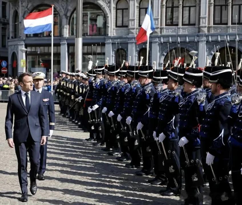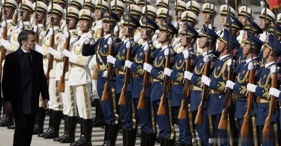 马克龙在中国和荷兰检阅三军仪仗队,相同表情严肃,一脸肃穆,眼睛不离仪仗队,非常有
