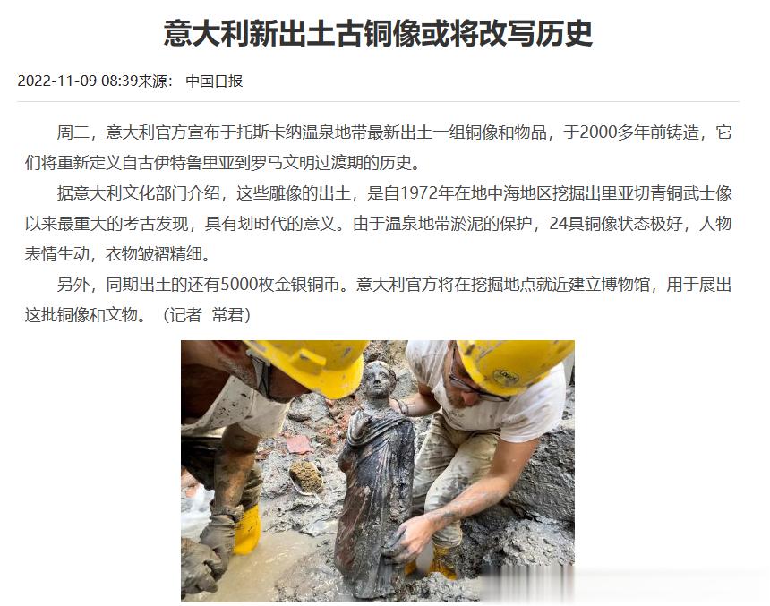 再看这个:在意大利托斯卡纳大区的一处古罗马遗址中,考古人员发现了一批24具青铜雕像与大约5000枚金银铜币,保存完好,年代可追溯到2000年前。