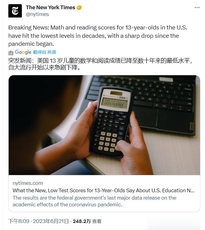 11年后,纽时写到“美国13岁儿童的数学和阅读成绩已降至数十年来的最低水平”。