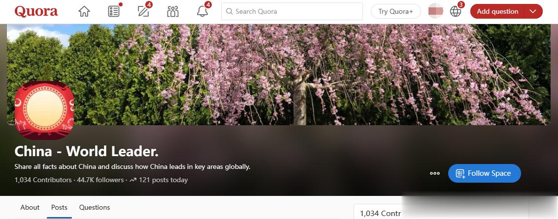 以哪个“中国--世界领导者”为例,1034 贡献者,44.7K 粉丝,在Quora其实算非常多了。