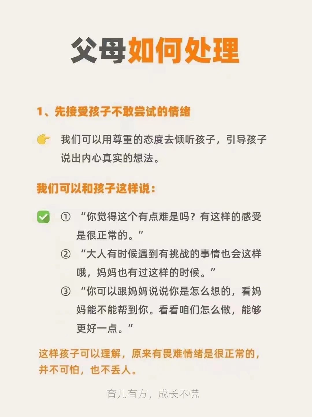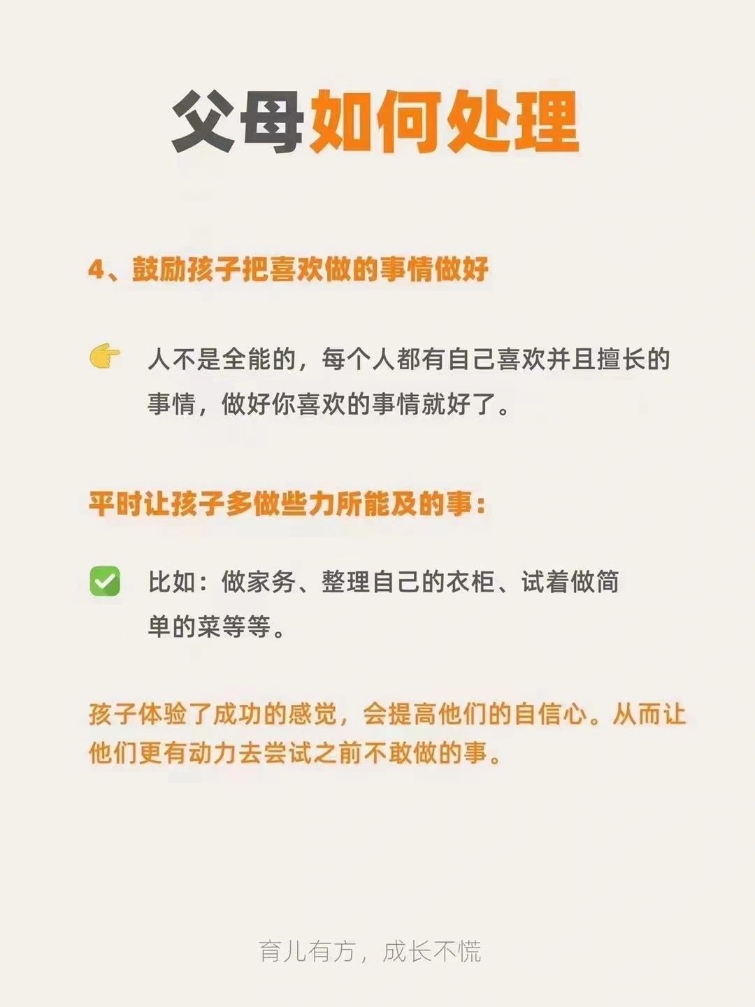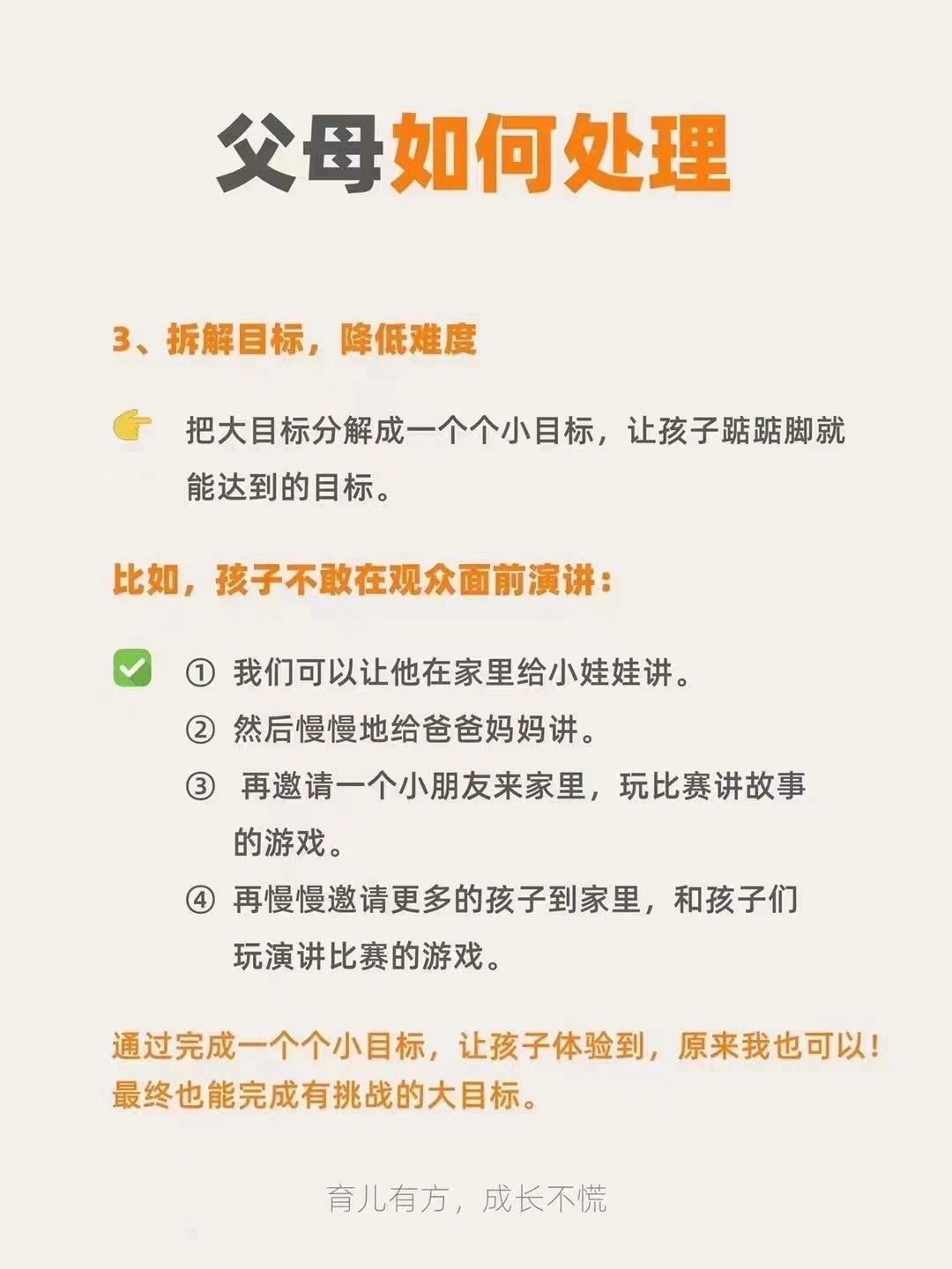 我们的孩子经常在做一些事情的时候,会没有自信心,总觉得“我不行”,这个时候妈妈要做到以下几点,慢慢的去培养孩子的自信心。 1、这样孩子可以理解,原来有畏难情绪是很正常的,并不可怕,也不丢人。 2、让孩子明白,我们要鼓起勇气去尝试,而且通过练习,我们就能够做好件事。 3、通过完成一个个小目标,让孩子体验到,原来我也可以!最终也能完成有挑战的大目标。 4、孩子体验了成功的感觉,会提高他们的自信心。从而让他们更有动力去尝试之前不敢做的事。