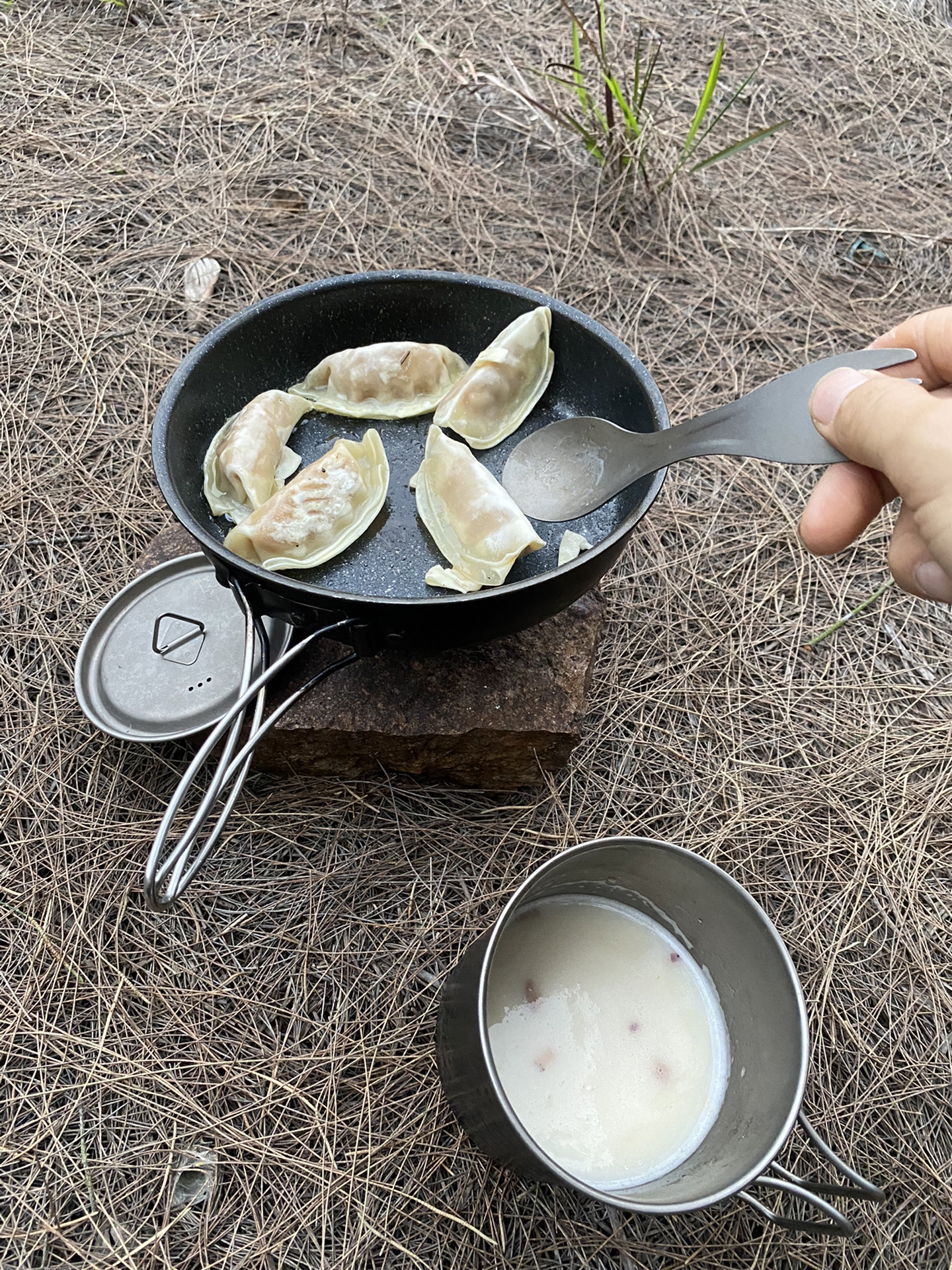 锅:750ml钛杯用了好久没换,是因为他110克的重量,既可以当锅,烧开水,当杯子喝茶,也可以煮饺子煮面。