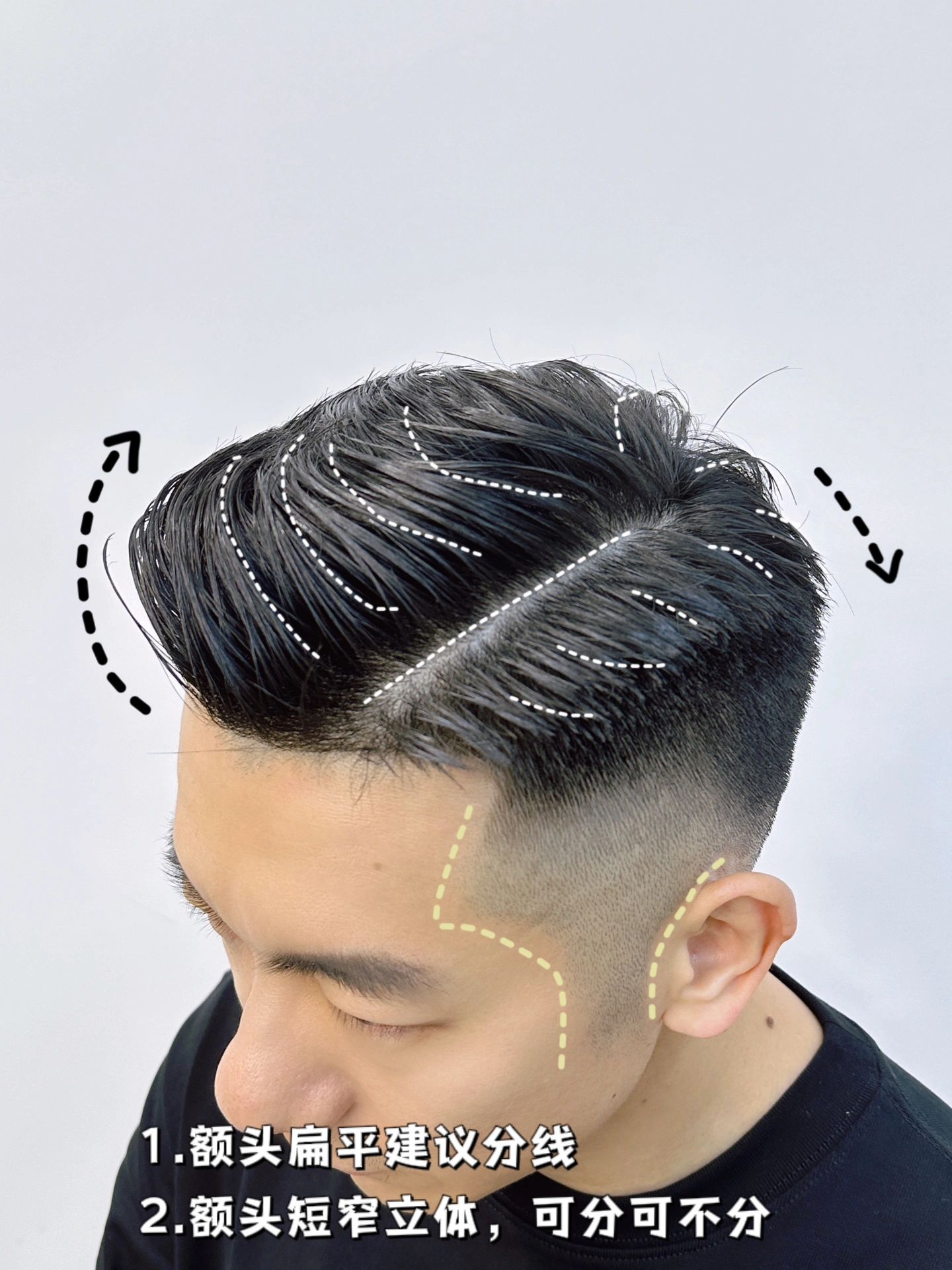 清爽短发我选择用质地比较偏硬一点的发泥或发蜡去做造型,刘海全部向上梳,用发泥抓出造型,露出光洁的额头,头顶的头发沾些发泥向前抓,两边头发最好短一些紧贴头皮的长度,这样看起来会整洁干净很多。