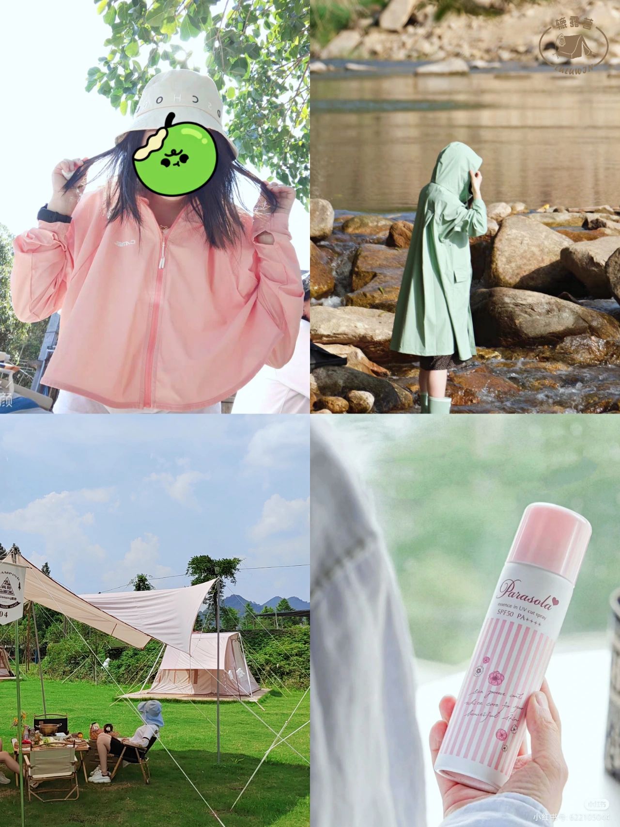 防雨防晒篇Auberge防晒渔夫帽:超大帽檐,可以把脖子肩颈都遮住,还有防风绳,有大风也不怕。防晒喷雾:准备一瓶防晒喷雾,全身都喷一篇,再也不怕晒黑了。防晒衣:夏季露营防晒要做全套,虽然天气很热,准备一款轻薄透气的防晒衣还是很有必要的。Joycorn加可雨衣:夏季雨天也会比较多,夏日可爱的马克龙色系,很轻薄透气一点也不烦闷哦!。